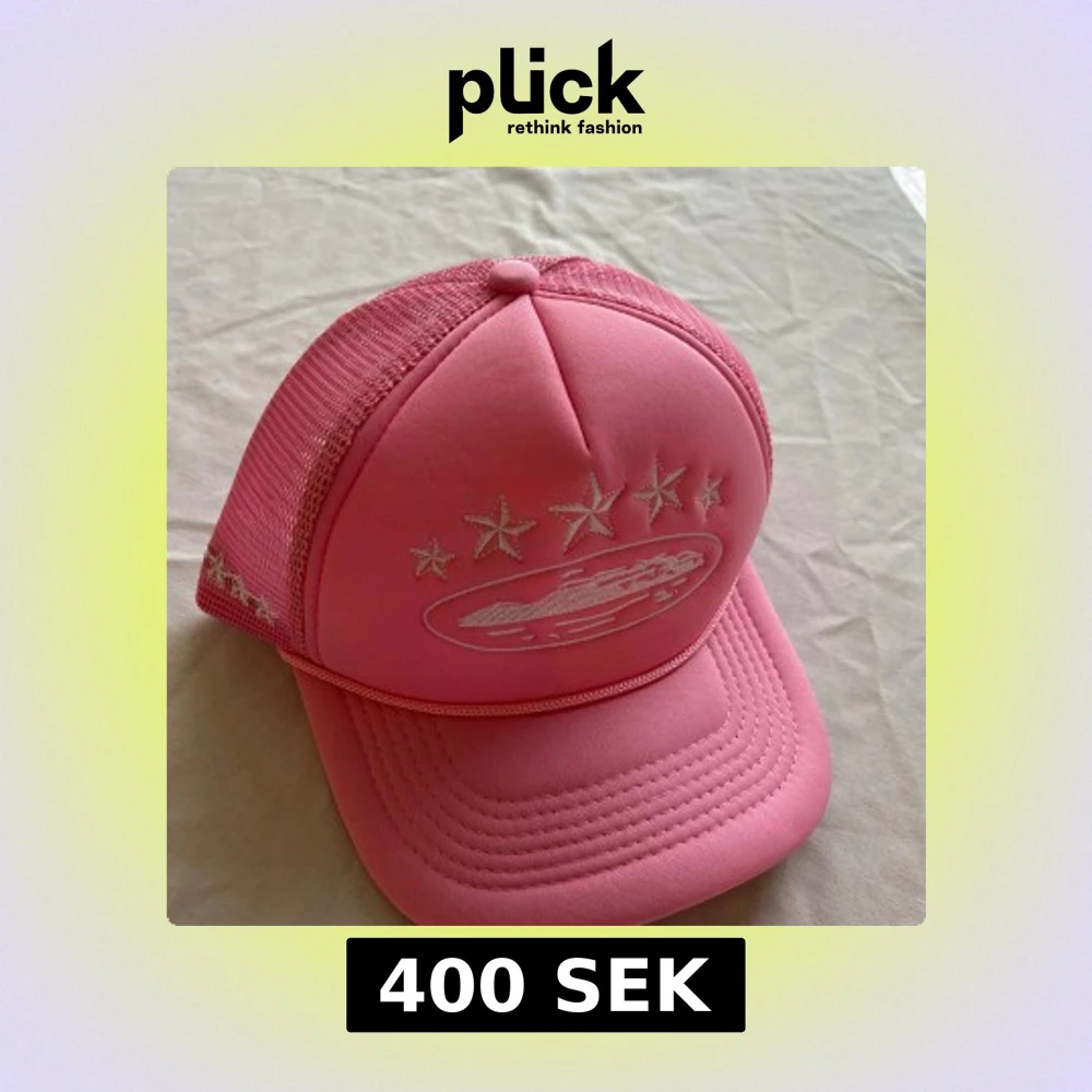 Säljer en rosa truckerkeps Corteiz med vit broderad logga och stjärnor framtill. Kepsen har mesh på sidorna och bak, samt böjd skärm. Insidan har band med Corteiz-tryck. Perfekt för dig som vill sticka ut med en färgstark accessoar.