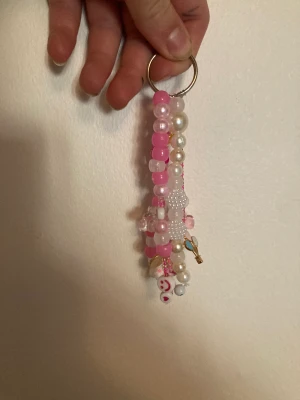 En jĂ€ttefin rosa nyckelring men pĂ€rlor, bubblepĂ€rlor, berlocker, smileys och blommor. đ€©đ©· 5 strĂ€nger.