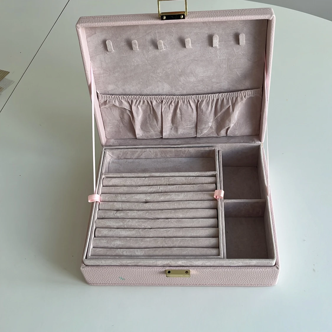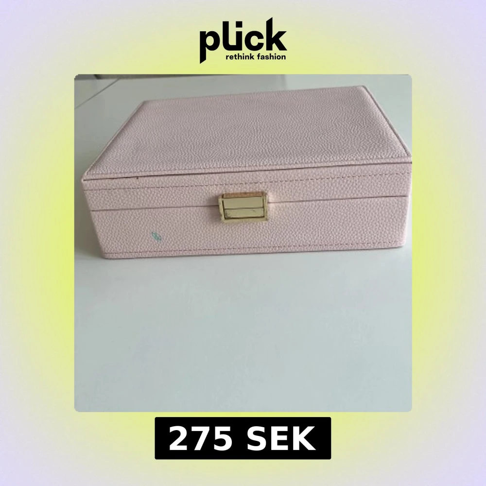 SÀljer ett elegant ljusrosa smyckeskrin med guldfÀrgad lÄsdetalj. Skrinet har flera fack och ringrader för smidig förvaring av smycken som ringar, halsband och armband. Insidan Àr klÀdd i mjukt tyg och har elastiska fickor och krokar för extra organisering.