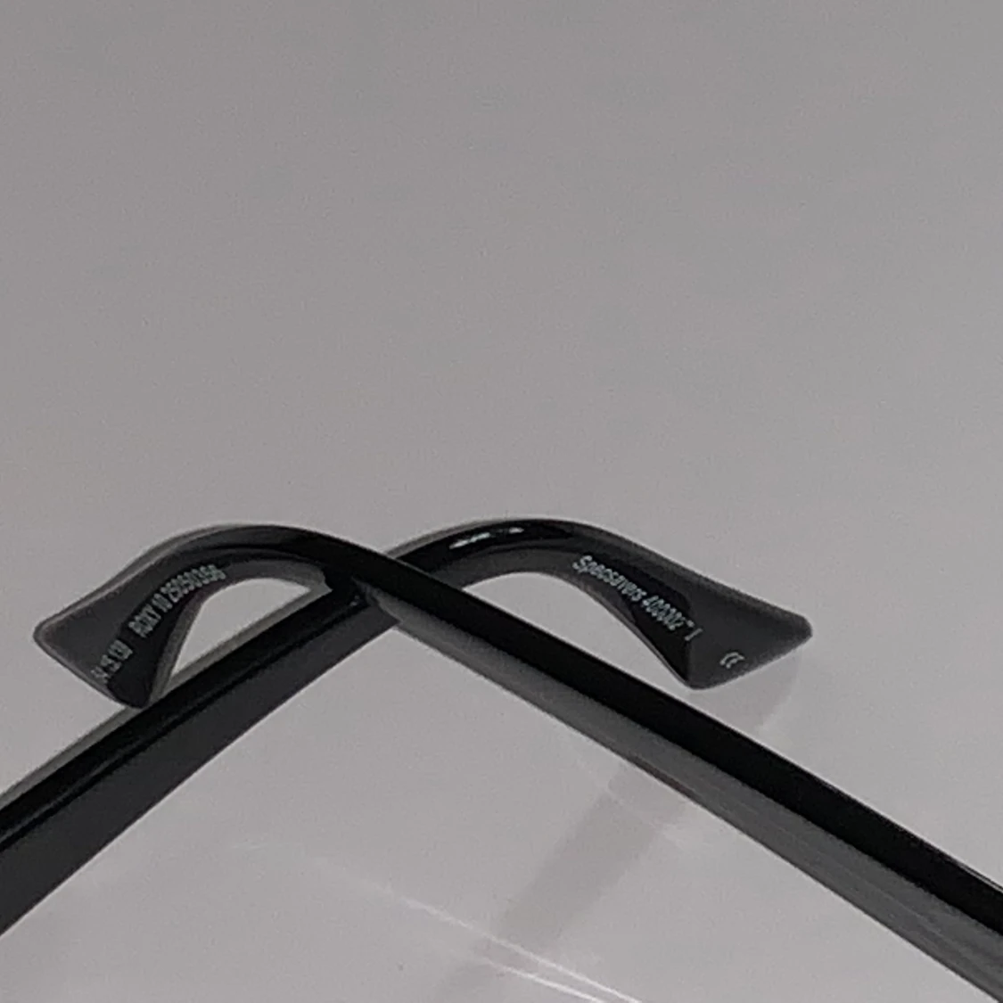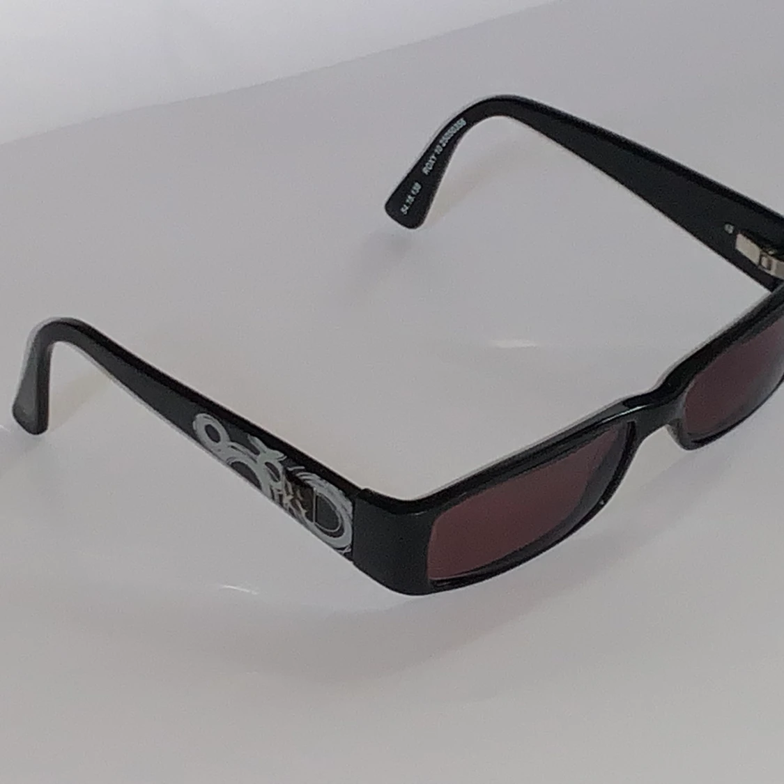 Svarta bågar med silverfärgade ’cirklar’ som dekoration Det som står på skalmarna: 54.15.138 ROXY 10 25050356 Specsavers 4000027 L CE Fint Beg Bruksskick: Jag ser inga repor på glasen. Det finns smårepor/skav på bågarna som syns då man tittar närmare.