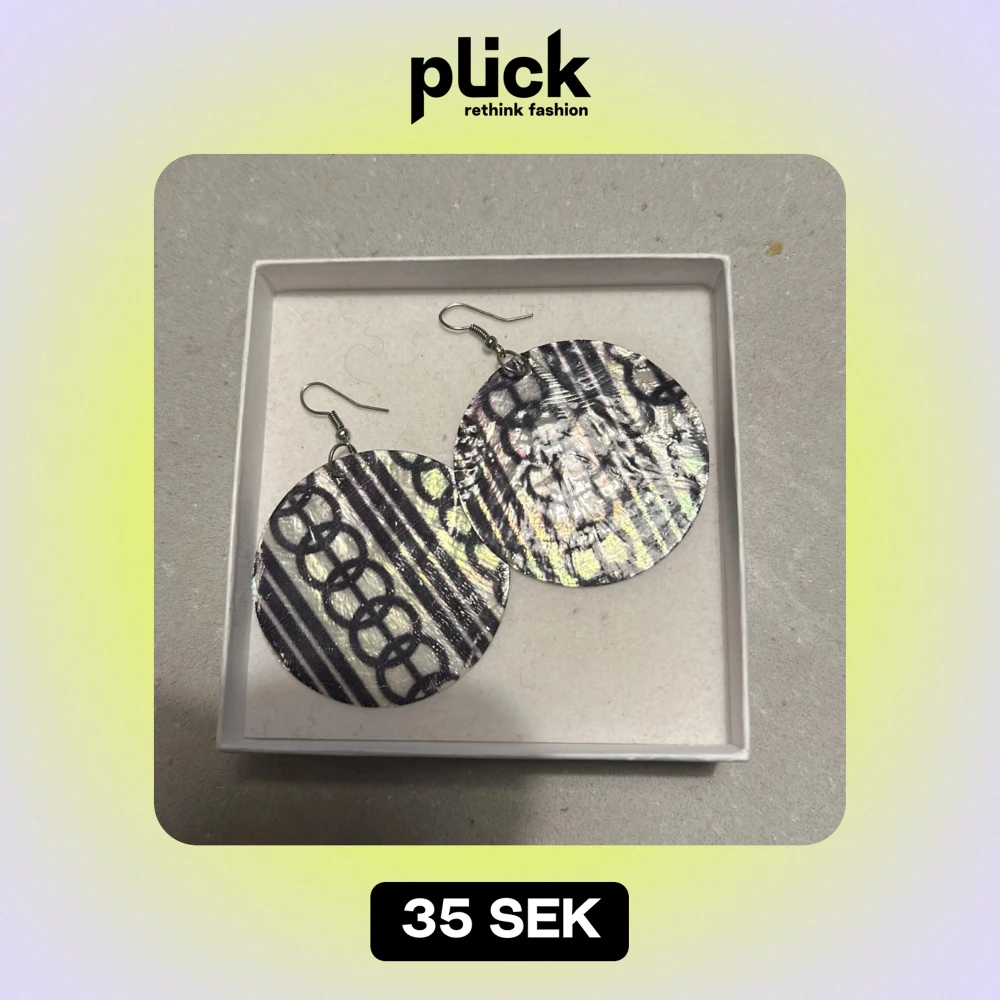Snygga runda örhängen med ett glansigt mönster i svart och silver. De har en cool design med cirklar och ränder som verkligen sticker ut. Perfekta för att ge din outfit en extra touch av glamour. Passar både till fest och vardag!
