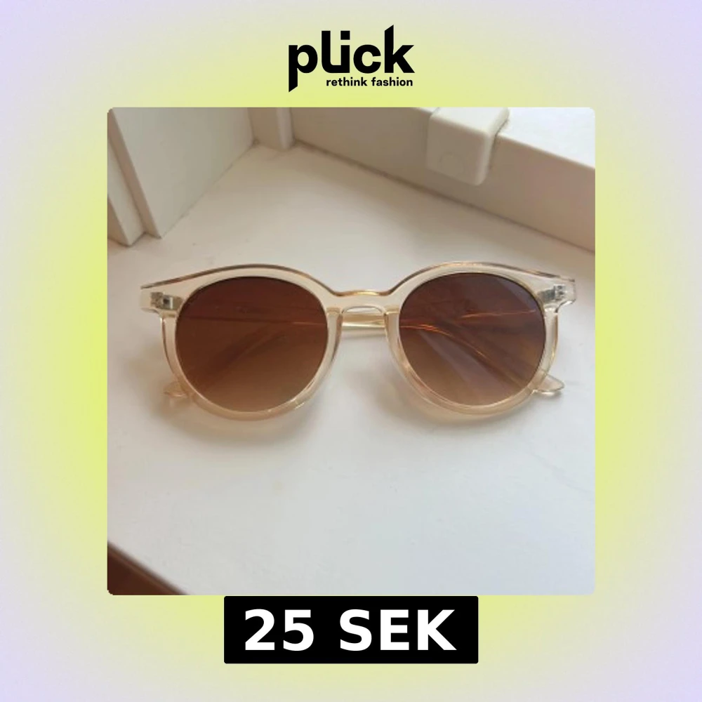 Snygga runda solglasögon med transparent beige plastbåge och bruna tonade glas. Perfekt accessoar för soliga dagar och ger en cool retrovibe. Lätta och bekväma att bära hela dagen.