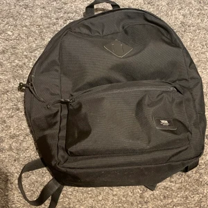 En svart ryggsäck med tre fack. Ett litet, ett stort och en för tex dator. Inga skador