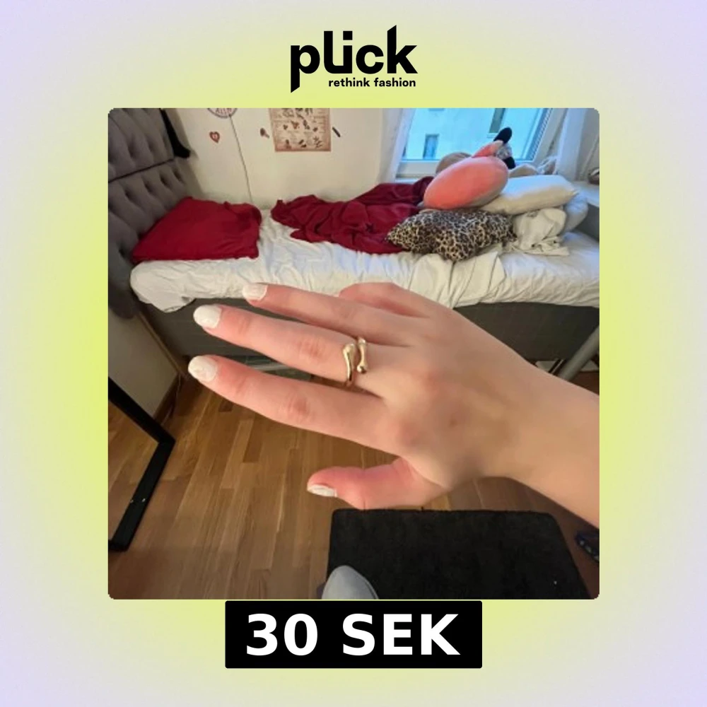 Säljer en snygg guldig ring med chunky design och cool, böjd form. Ringen har en öppen detalj framtill som ger den en modern och trendig look. Perfekt accessoar för att lyfta din outfit och sticka ut lite extra.