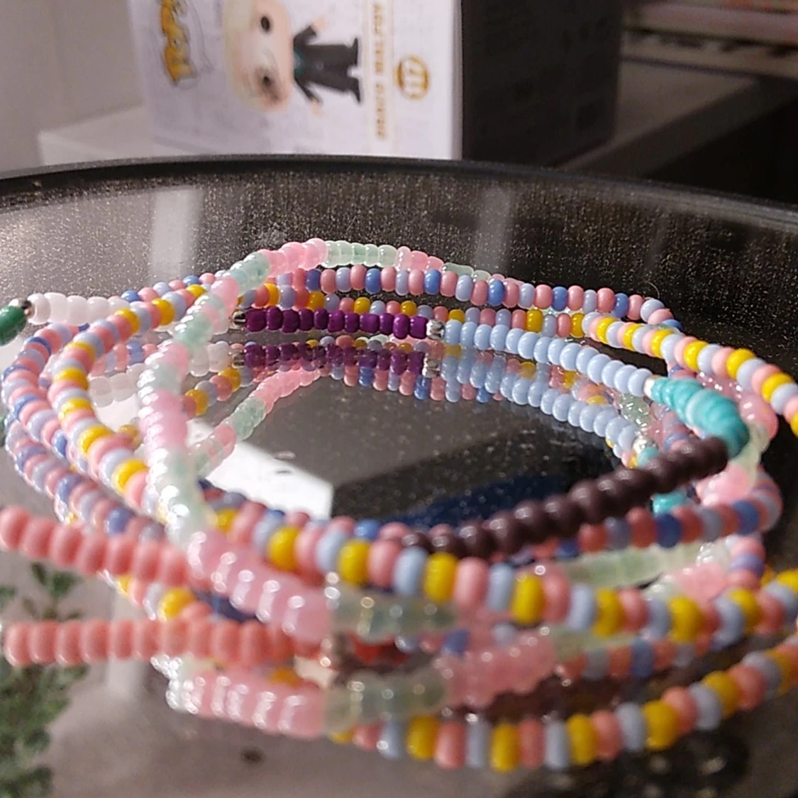 Fyra Multifärgade armband med många rosa pärlor. Det är stretch på tråden och passar de flesta