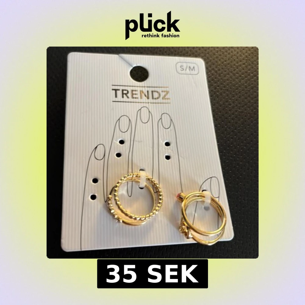Fyra snygga guldiga ringar från Trendz i storlek S/M. En ring har ett pärlband runt hela, en har små stenar, en är enkel och slät, och en har en liten rosa sten. Perfekt för att mixa och matcha till din stil.