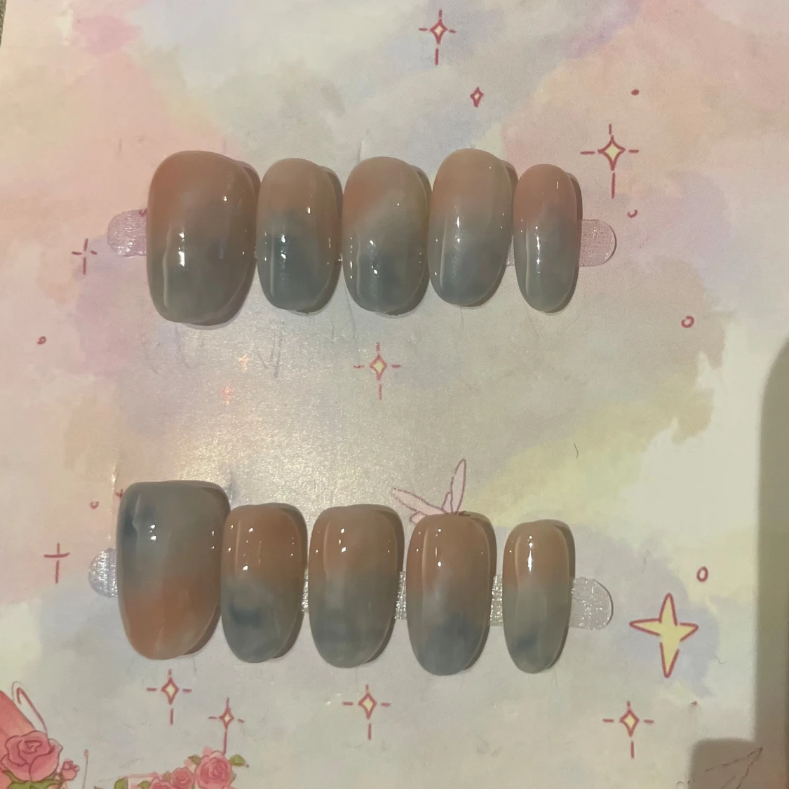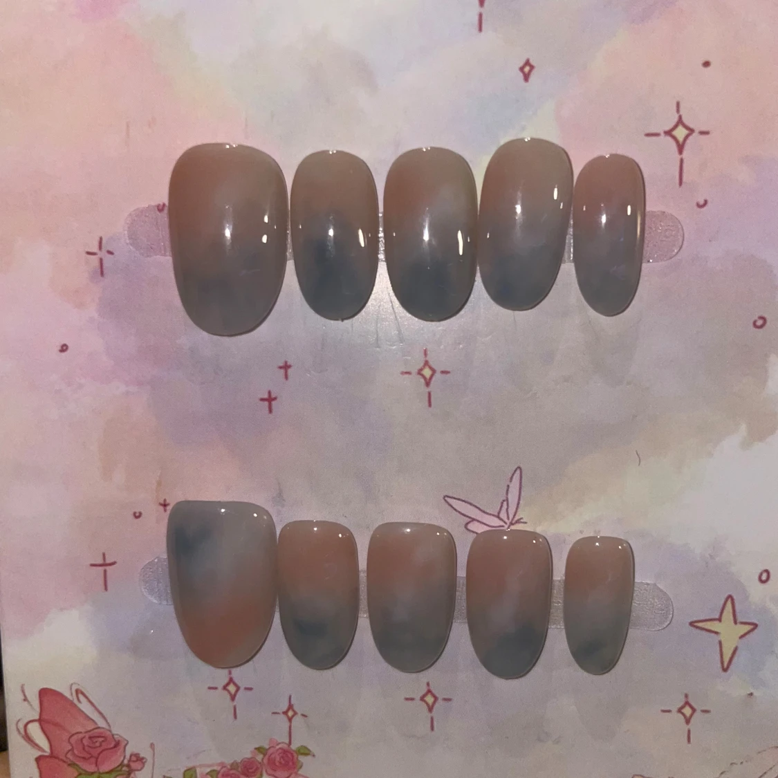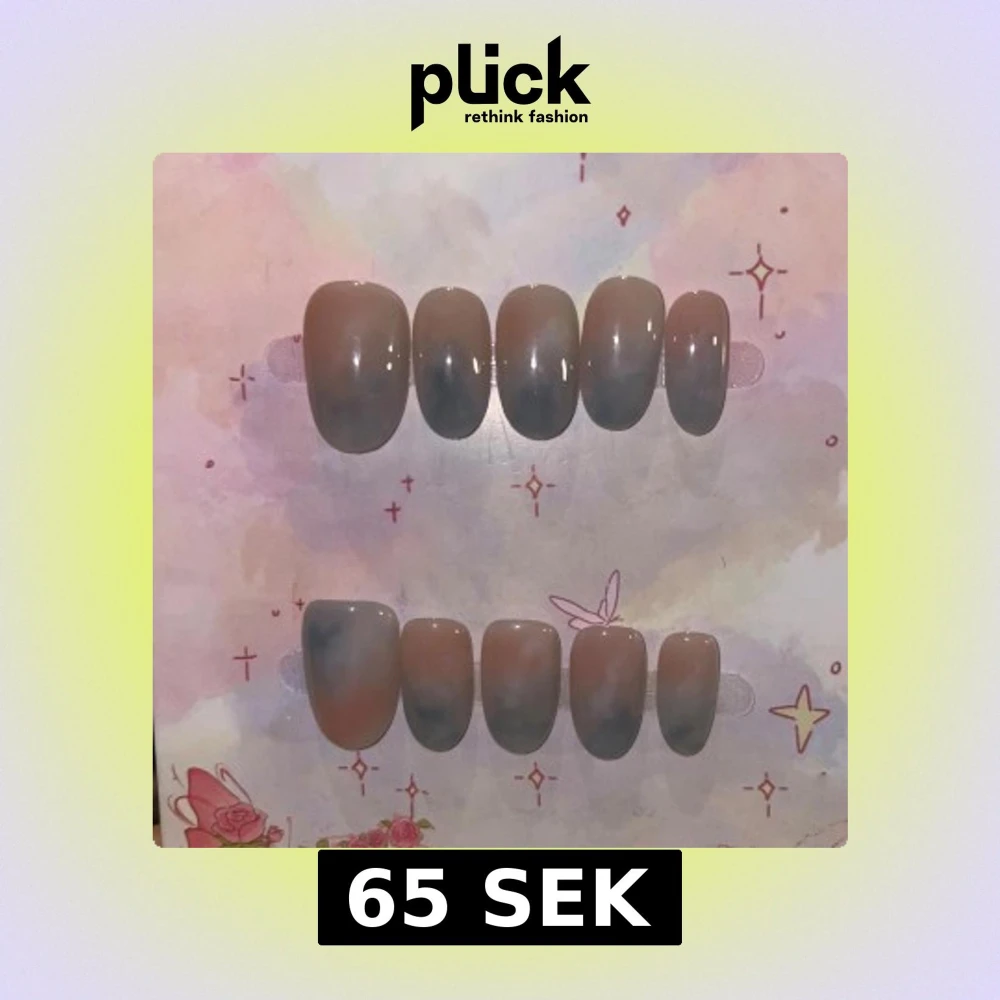 Snygga lösnaglar i en oval form med en trendig ombre-effekt i beige och blågrå toner. Naglarna har en glansig finish och passar perfekt för dig som vill ha en stilren men ändå unik look. Kommer i set om tio naglar i olika storlekar.