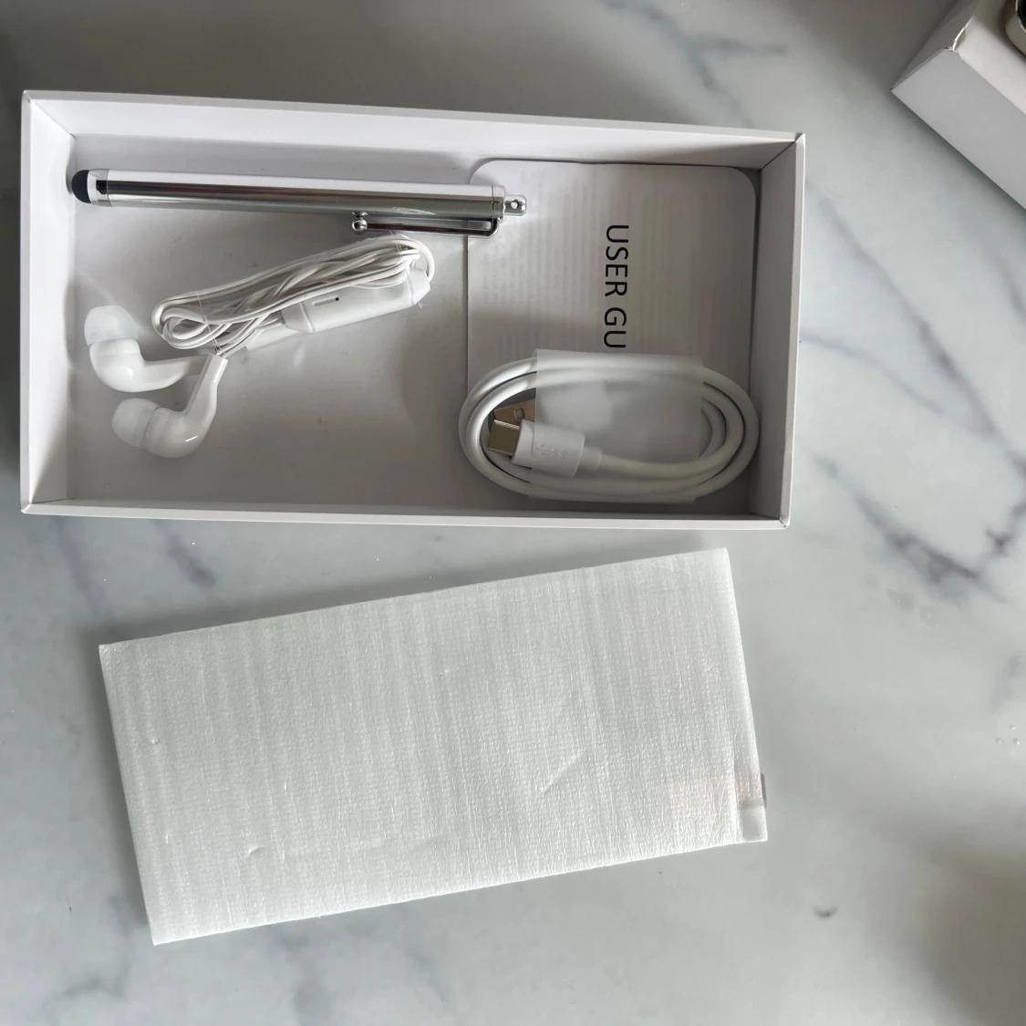 Det finns ingen bok på bilderna, utan det som visas är en mobiltelefon med tillbehör som hörlurar, laddkabel och styluspenna. Ingen information om boktitel, författare eller innehåll kan identifieras.