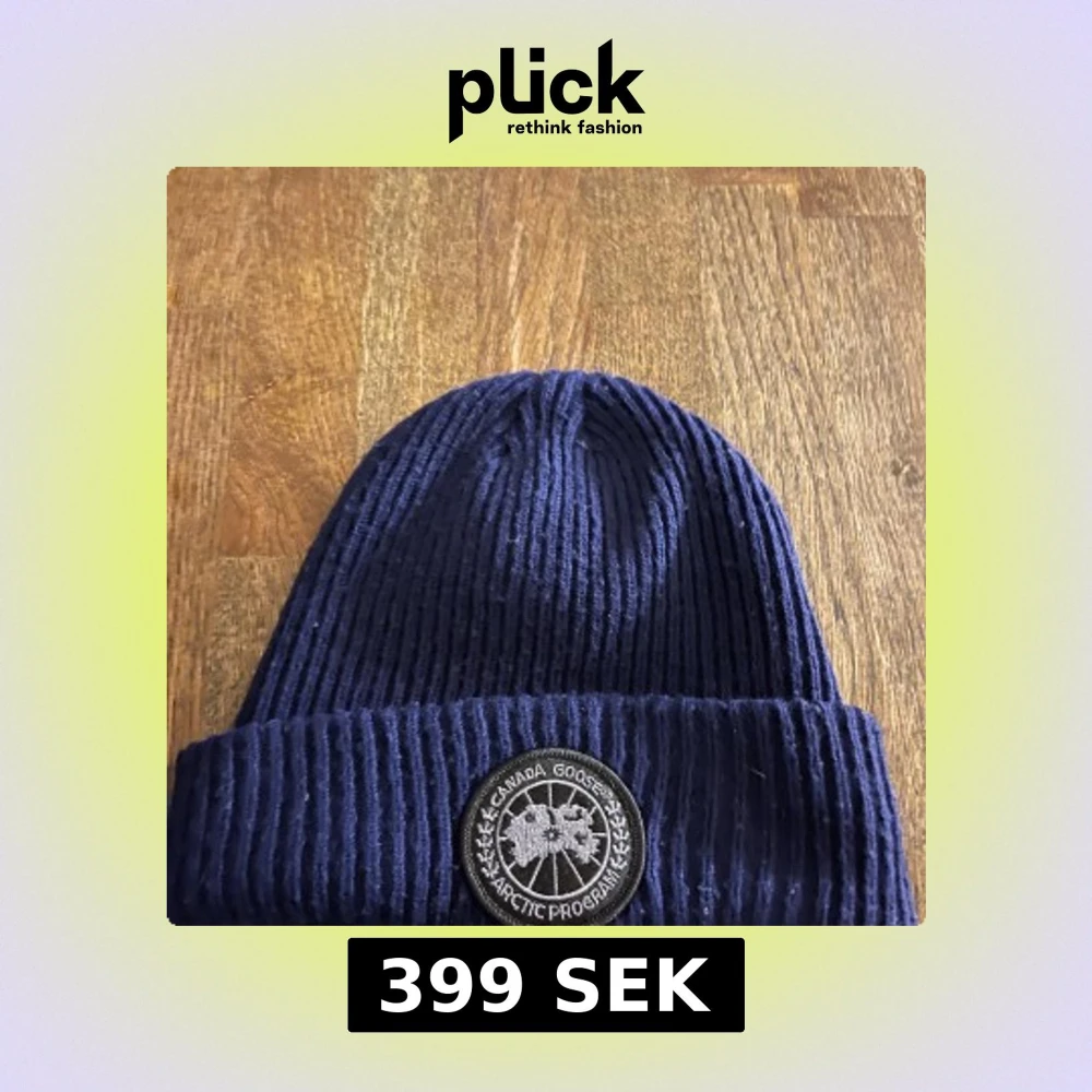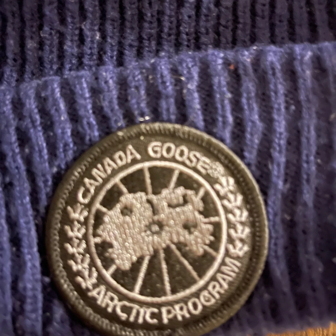 Snygg och varm mörkblå ribbad mössa från Canada Goose med ett broderat märke framtill. Perfekt för kyliga dagar.