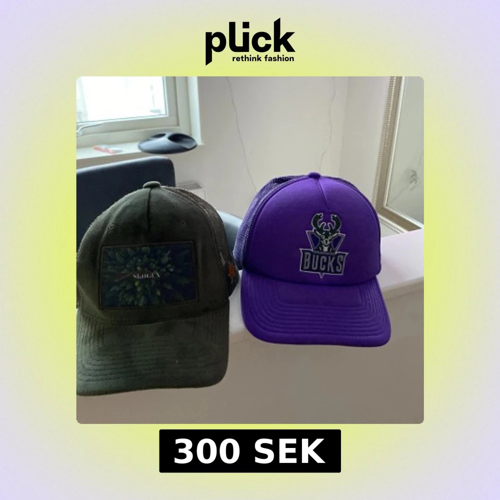 Säljer två kepsar för 300kr. En velvet mörk grön keps med en bild på skogen. En lila puffprint keps