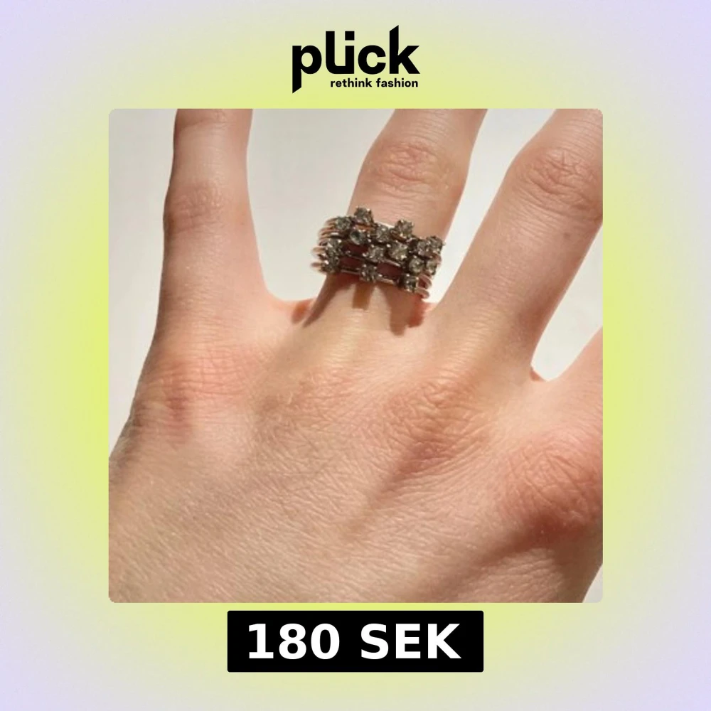 Säljer ett set av glittriga silverringar med flera små stenar. Ringarna har en elegant design och kan bäras tillsammans eller separat för olika stilar. Perfekt för att ge en touch av glamour till din look.
