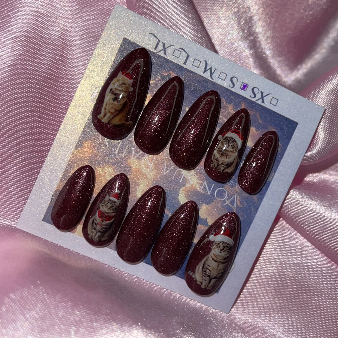 Set med medium långa, mandelformade lösnaglar i glittrande vinröd färg. Flera naglar har detaljerade motiv av katter med tomteluva, perfekt för dig som älskar både katter och jul. Naglarna kommer i storlek S: 15 mm, 11,5 mm, 12 mm, 11 mm, 9 mm