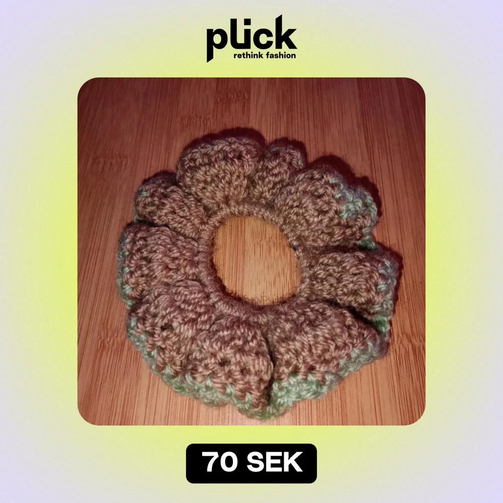 Snygg och unik virkad scrunchie i beige med gröna detaljer. Perfekt för att ge din frisyr en färgglad touch. Den är elastisk och passar de flesta hårtyper. Perfekt accessoarer för både vardag och fest! Skulle du vilja ha en i en specifik färg är det bara att skriva. Alla accessoarer är gjorda av mig.