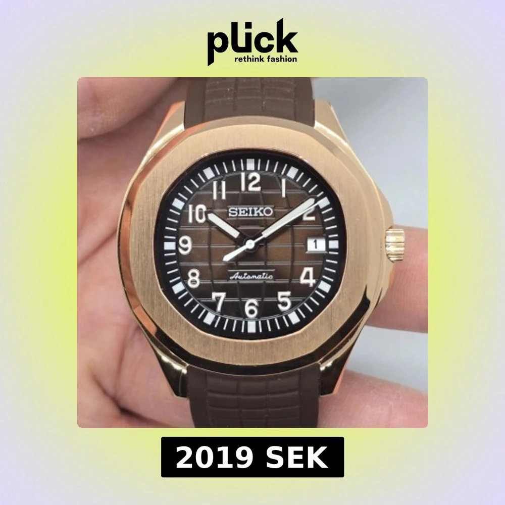 Snygg automatisk klocka Seikmod med fyrkantig boett i guldfärgad metall och brunt rutmönstrat urtavla. Brunt gummiband med struktur och datumvisning vid klockan tre. Perfekt accessoar för dig som gillar stilren design med lyxig känsla.