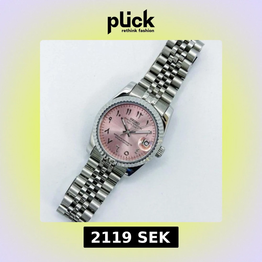 Snygg Seikmod Datejust med en glansig rosa urtavla och arabiska siffror. Klockan har en robust länk i silverfärgat stål och klassisk räfflad bezel. Datumfönster vid klockan tre med förstoringsglas. Perfekt accessoar för dig som gillar stilren design med en twist.