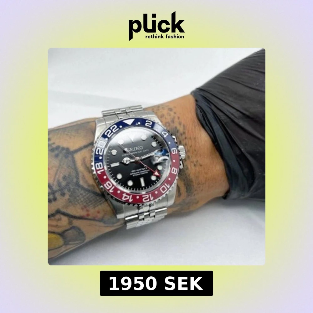 Snygg Seikmod GMT-Master II med klassisk Pepsi-bezel i blått och rött. Klockan har svart urtavla, datumfönster med förstoringsglas och robust länkarmband i silverfärgat stål. Perfekt för dig som gillar sportig och tidlös stil.