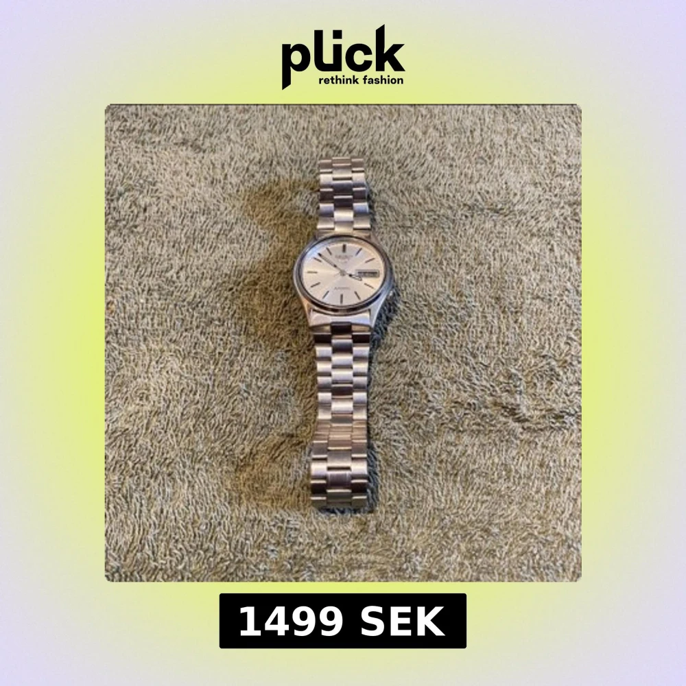 Snygg Seiko 5 automatisk klocka med klassisk rund urtavla i silver och dag/datumvisning. Länken är i rostfritt stål och har en stilren, polerad finish. Perfekt för dig som gillar tidlös design och vill ha en klocka som sticker ut på handleden.