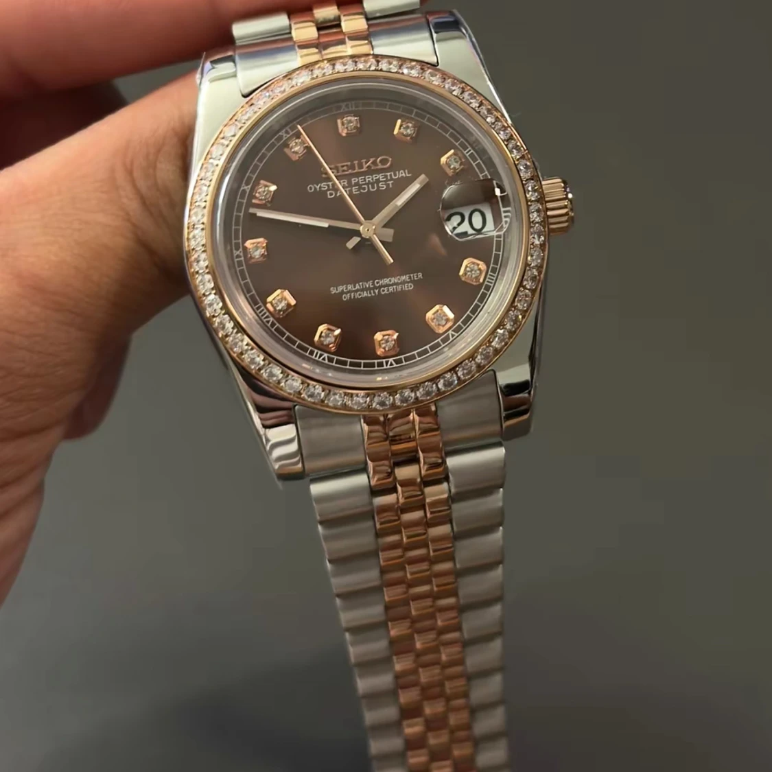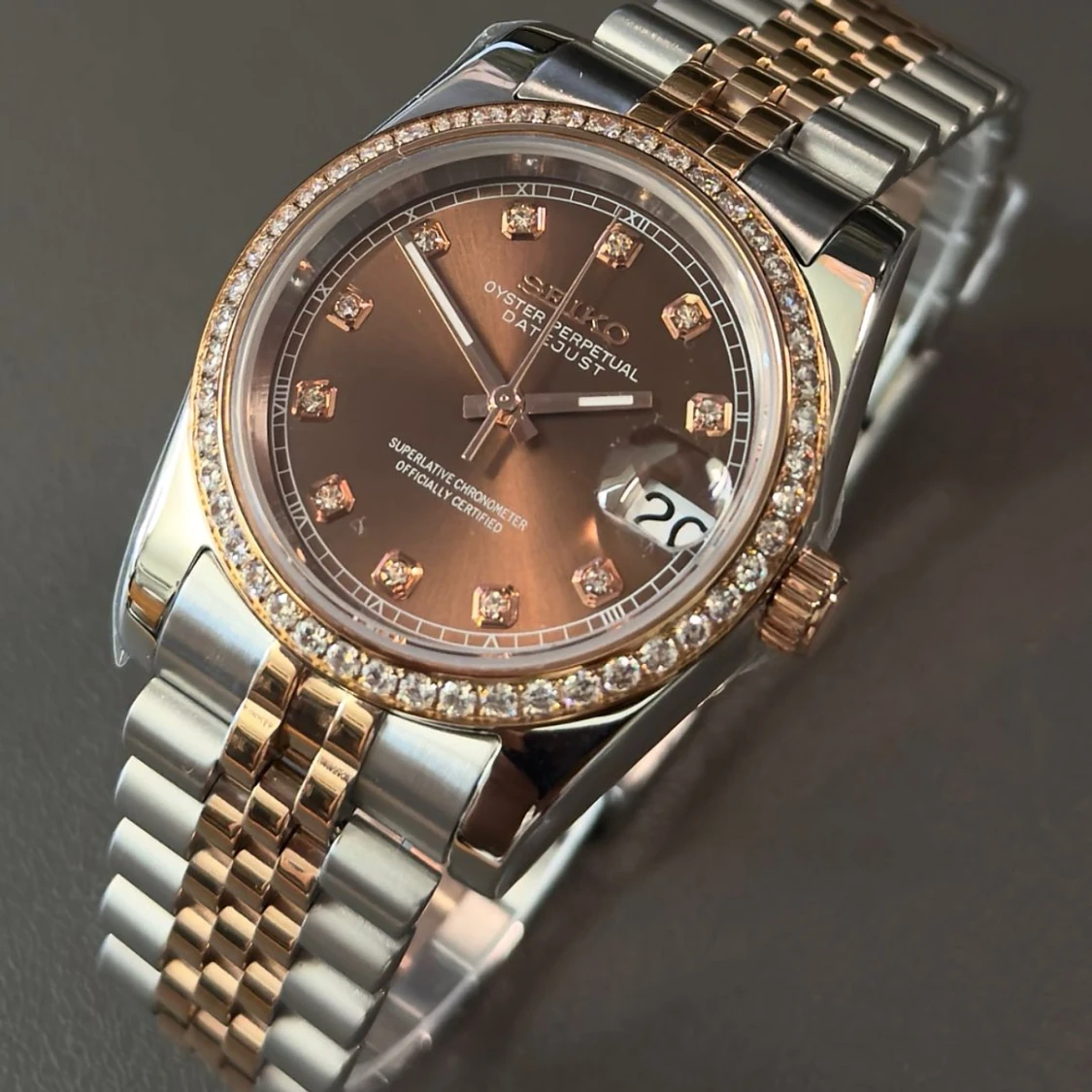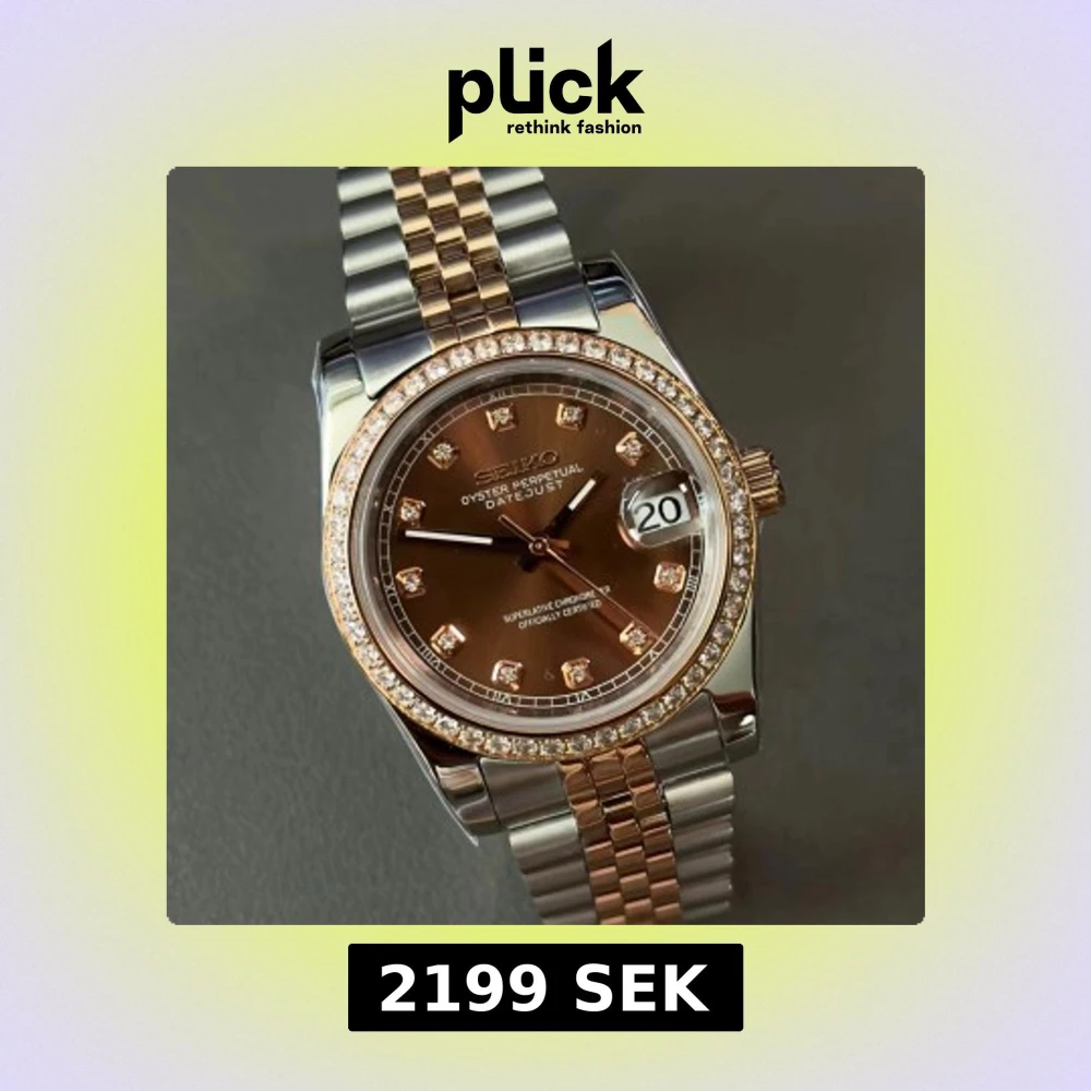 Snygg Seiko Datejust med brun urtavla, guldiga index med stenar och tvåfärgad länk i silver och guld. Boetten är dekorerad med glittrande stenar runt ringen och har datumfönster vid kl 3. Klassisk och lyxig design som sticker ut.