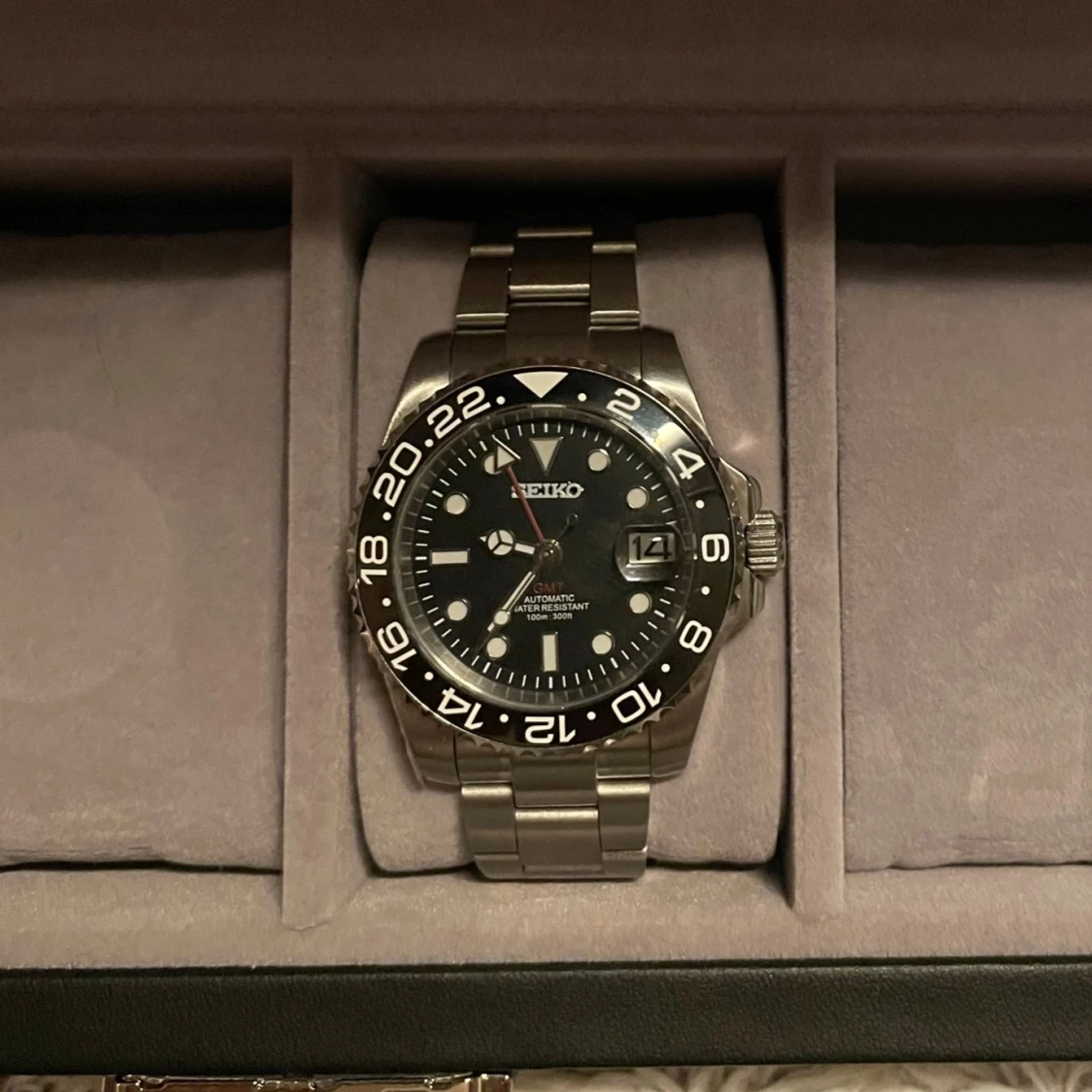 Svin snygg Seiko klocka med svart urtavla och datumvisning. 40mm. Den har en silverfärgad boett och armband i rostfritt stål. Klockan har en tydlig 24-timmarsmarkering på den svarta ringen runt urtavlan. Klockan efterliknar den kända modellen GMT. Alla länkar tillkommer såklart vid köp.