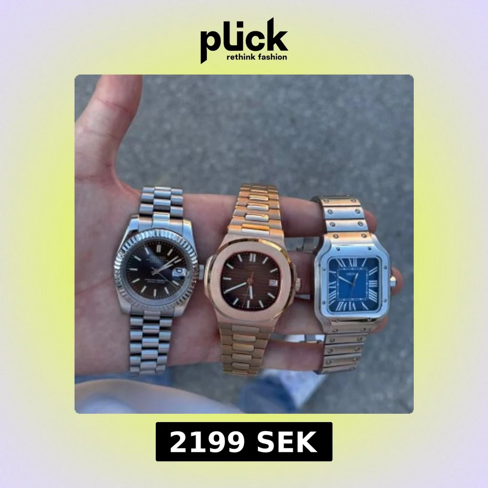 Samling Seiko klockor med olika stilar: klassisk stålmodell med svart urtavla och datum, guldtonad länk med brun urtavla, fyrkantig modell med blå urtavla och romerska siffror, samt sportig kronograf med svart gummiband och guldiga detaljer. Perfekt för dig som gillar snygga accessoarer.