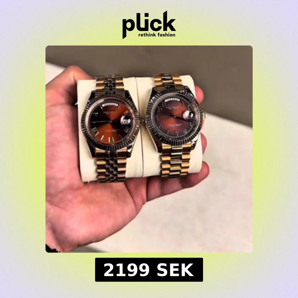Två exklusiva herrklockor från Seiko med tvåfärgad länk i guld och silver samt rödbrun urtavla. Klockorna har dag- och datumvisning, räfflad bezel och klassisk design. Perfekt accessoar för dig som gillar lyxiga detaljer.