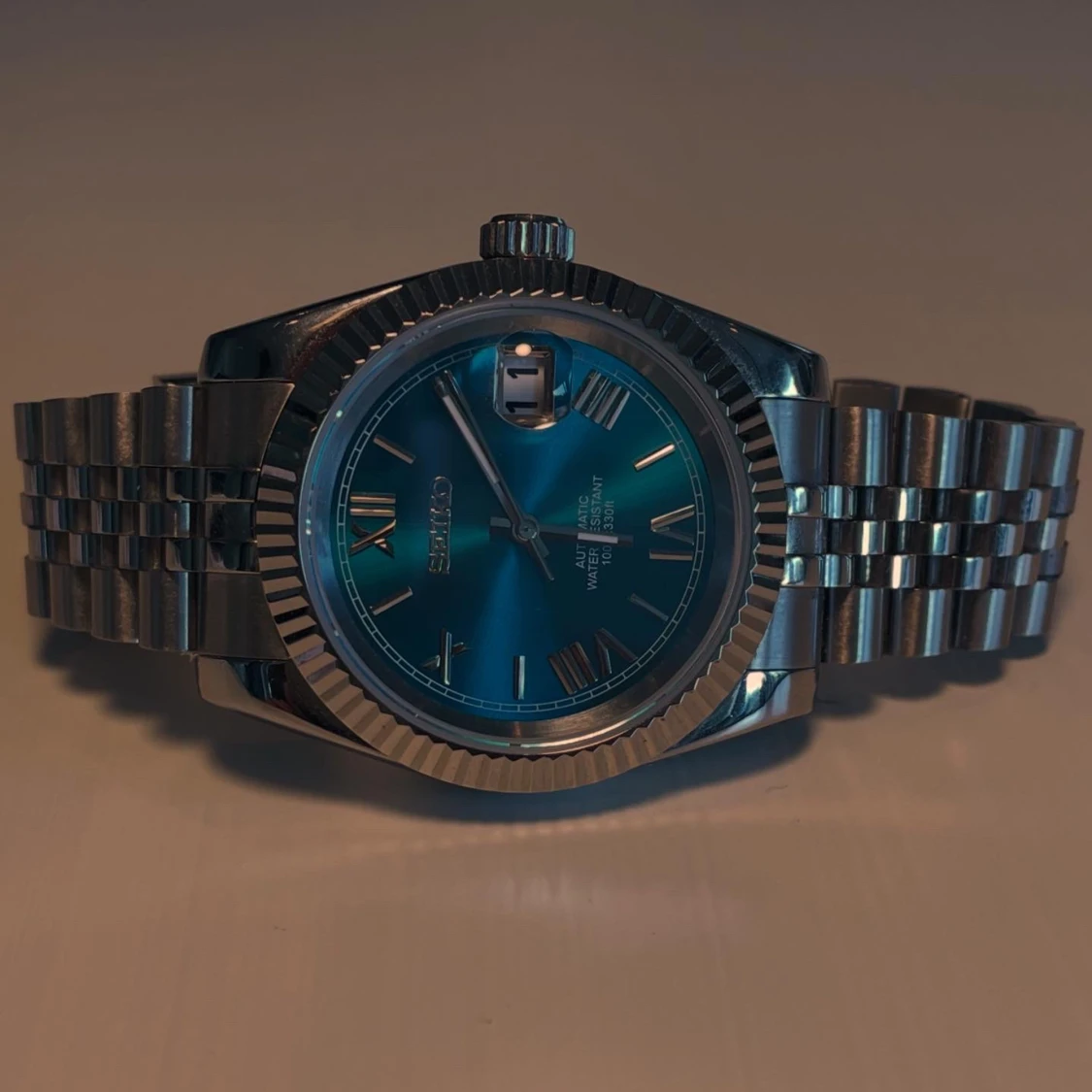Helt Ny🙌‼️Säljer en stilren Seiko Mod automatisk klocka med blå urtavla och datumvisning med ett NH34 movement🙌‼️Klockan har ett klassiskt silverfärgat armband i metall och boett med räfflad kant. Passar till alla outfits och grishstilen🦞💸🍾Baksidan har ett transparent glas som visar urverket. Perfekt för dig som gillar snygga detaljer. Alla länkar och box till kommer vid köp🙌‼️💸 Ställ gärna frågor💭