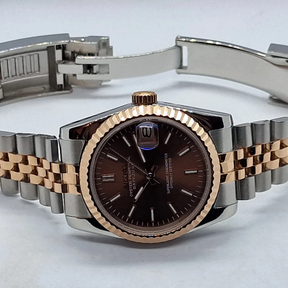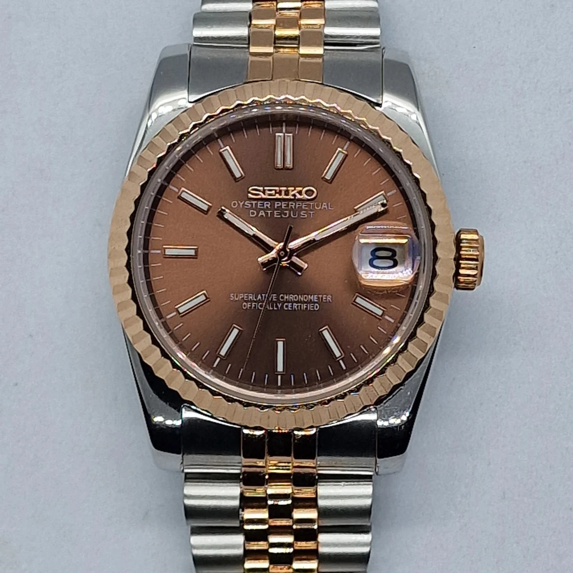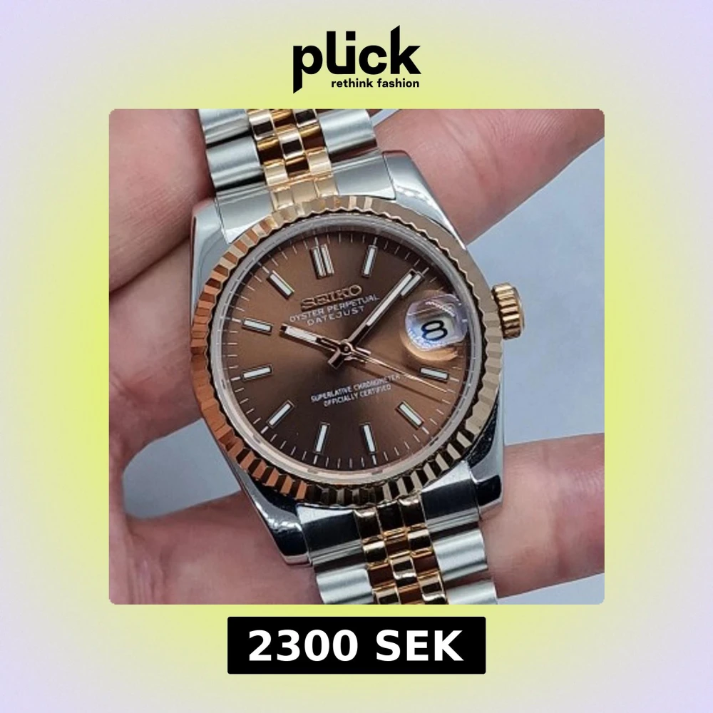 Snygg Seiko Oyster Perpetual Datejust med brun urtavla, silver- och guldfärgad länk i rostfritt stål. Klockan har räfflad guldfärgad bezel, datumfönster med förstoringsglas och automatiskt urverk. Perfekt accessoar för dig som gillar klassisk och lyxig stil.