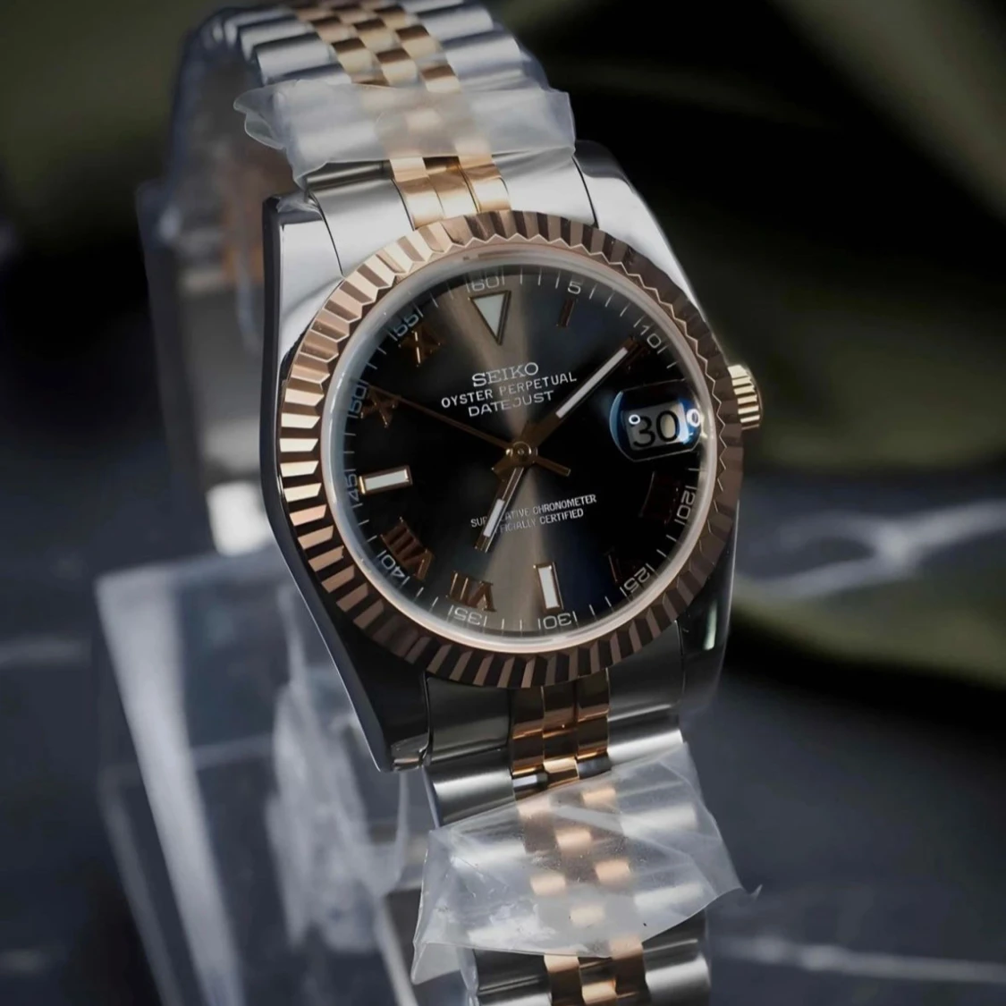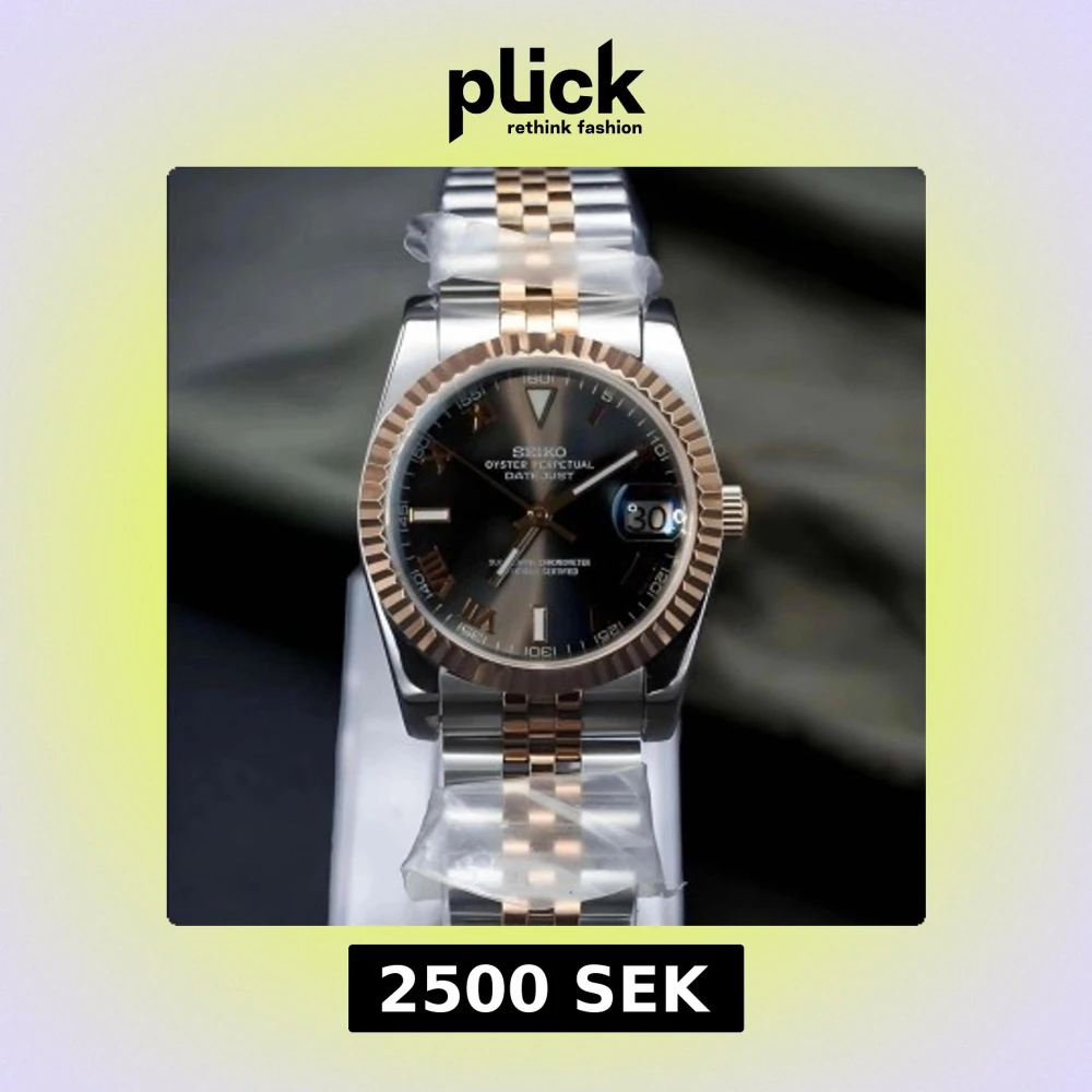Snygg Seiko Datejust med svart urtavla, romerska siffror och datumfönster. Klockan har en tvåtonad länk i silver och guld samt räfflad guldfärgad ring runt urtavlan. Klassisk och stilren design som sticker ut på handleden.