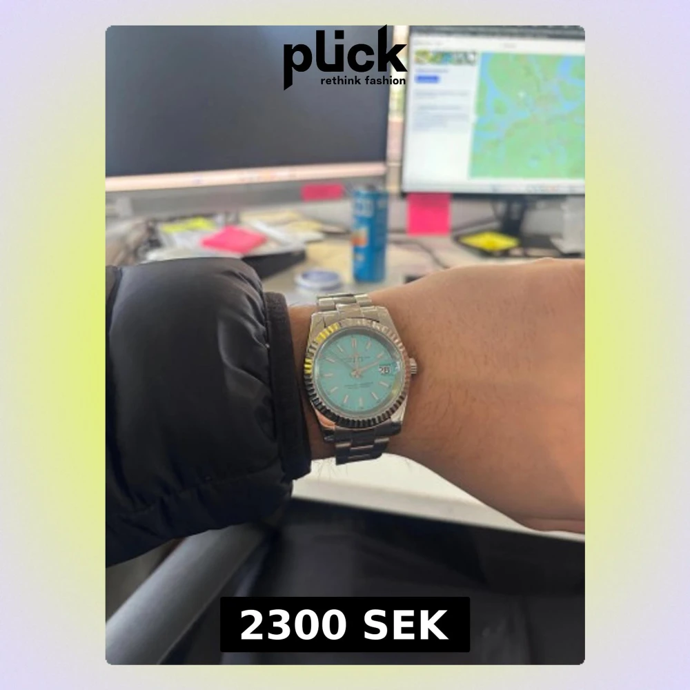Säljer en Seiko Oyster Perpetual Datejust med turkos urtavla och datumvisning. Klockan har en rund boett i silverfärgat stål och en klassisk länkarmband i metall. Automatisk rörelse syns genom bakboetten. Stilren och modern design som sticker ut och blänker. Denna är en modd klocka från bara seikos delar. Extra länkar tillkommer!