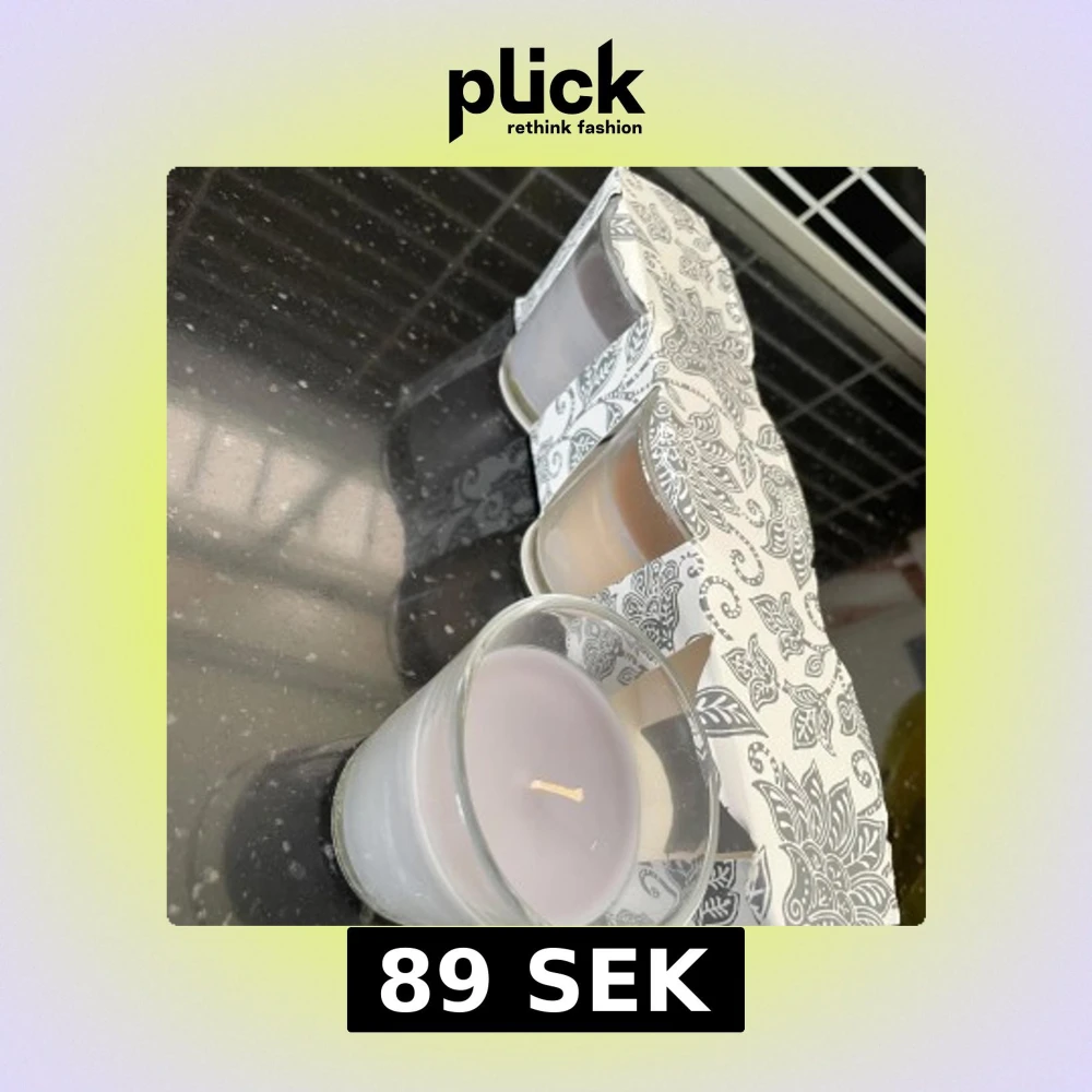Säljer ett set med tre doftljus i glasbehållare. Ljusen har olika färger: ljuslila, beige och ljusgrå. De kommer i en dekorativ förpackning med svartvitt mönster. Perfekt för att skapa en mysig atmosfär hemma.