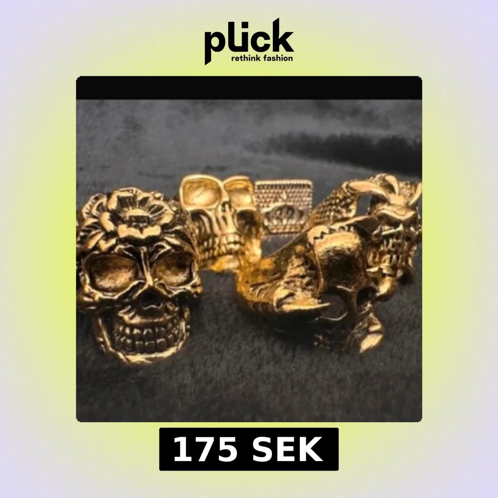 Säljer ett set med fem nya ringar i guldfärgad metall med olika dödskalledesigner – blommor, korslagda ben och texturer. Varierande storlek (innerdiameter ca 1,8–2,5 cm, höjd 2–3 cm), så de kan bäras på olika fingrar. Perfekta för dig som gillar punk, goth eller alternativ stil. Priset är fast – ingen prutning – men bundlerabatt ges. Rensar smyckeslådan, så kolla gärna mina andra annonser också!