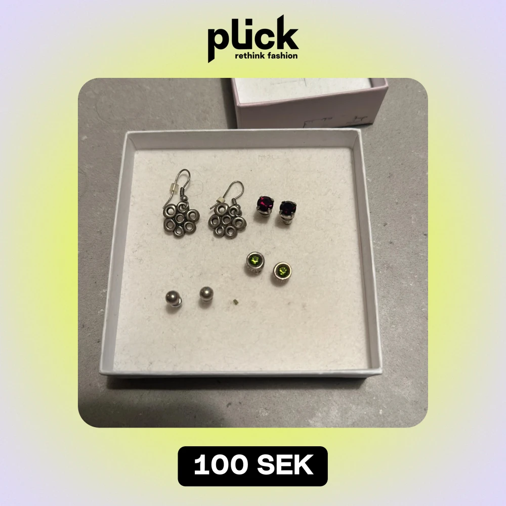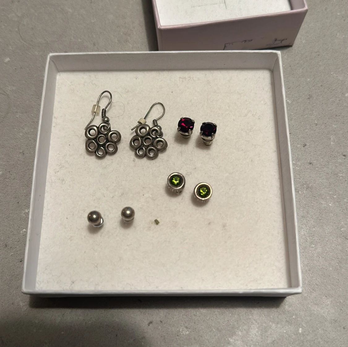 Säljer ett set med fyra olika par örhängen. Ett par är silverfärgade med hängande cirklar, ett par med mörkröda stenar, ett par med gröna stenar och ett par enkla silverkulor. Perfekt för att mixa och matcha till olika outfits!