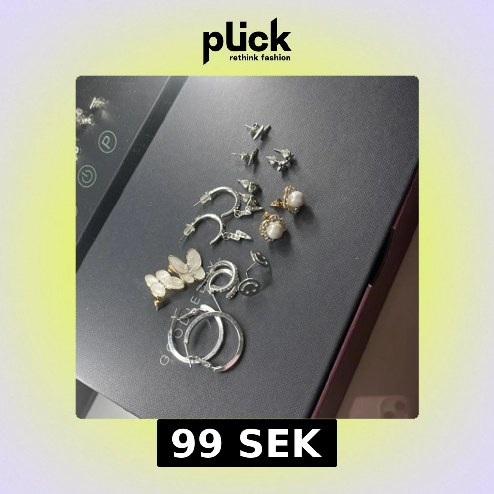Ett set med olika örhängen, inklusive silverfärgade hoops, pärlörhängen med gulddetaljer, fjärilsformade örhängen och små stiftörhängen i olika former. Perfekt för att mixa och matcha till olika tillfällen.