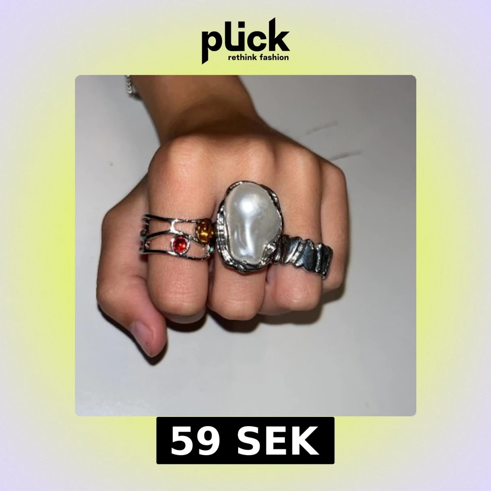 Säljer ett set med tre unika silverfärgade ringar. En har en stor oregelbunden pärla i mitten, en har vågig design och den tredje har färgglada stenar i rött, gult och grönt. Perfekt för dig som vill sticka ut med dina accessoarer.