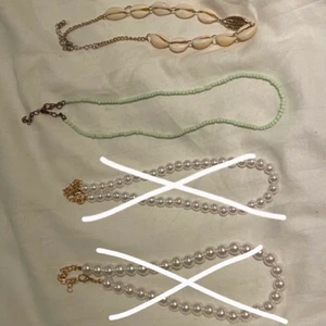 Alla 3 pärlhalsband kommer från shein och snäckhalsbandet kommer från Gina Tricot🥰 kedjan på det gröna pärlhalsbandet har blivit lite missfärgat annars är alla 4 i väldigt bra skick! 15kr styck eller alla för 50kr ( + frakt )🤍 ‼️De kryssade pärlhalsbanden är sålda‼️