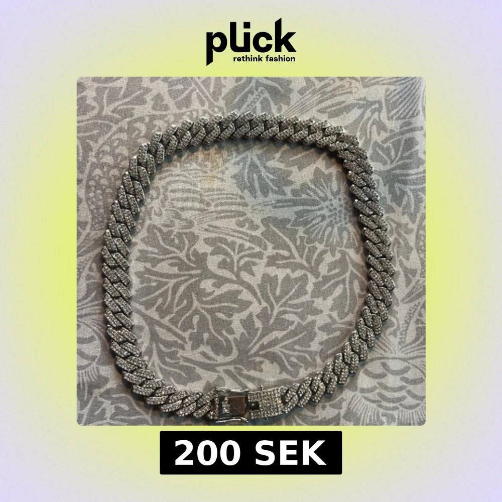 Säljer ett chunky Halsband i silverfärg med glittrande stenar på varje länk. Armbandet har en bred kedjedesign och ett lås som också är dekorerat med stenar. Perfekt för dig som gillar att sticka ut med accessoarer.