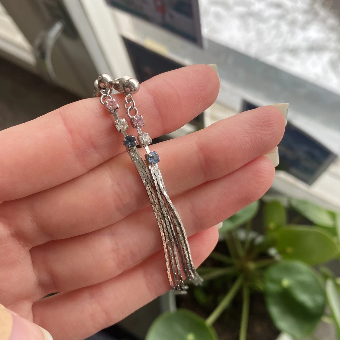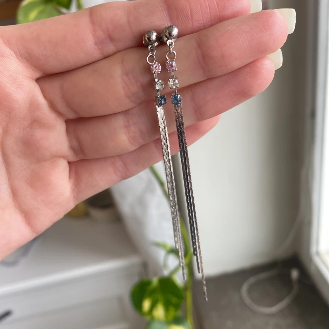 Silvriga örhängen med sten i rosa och blått.