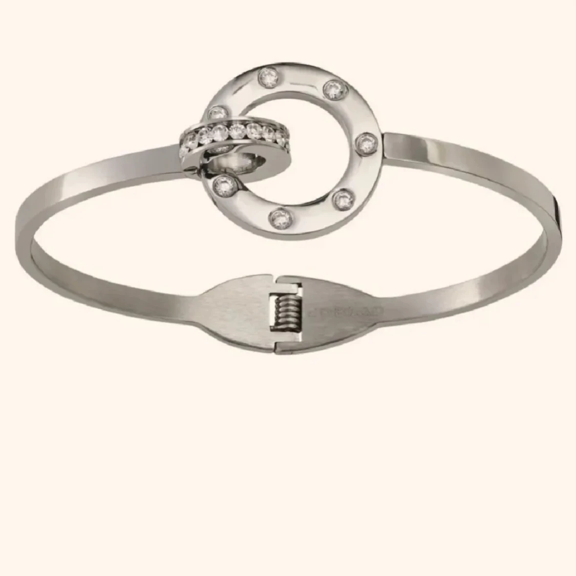 Snyggt armband i silverfärg från Edblad med två cirklar framtill, varav en är dekorerad med gnistrande stenar. Stilren och modern design som ger en lyxig känsla. Kommer i originalask.