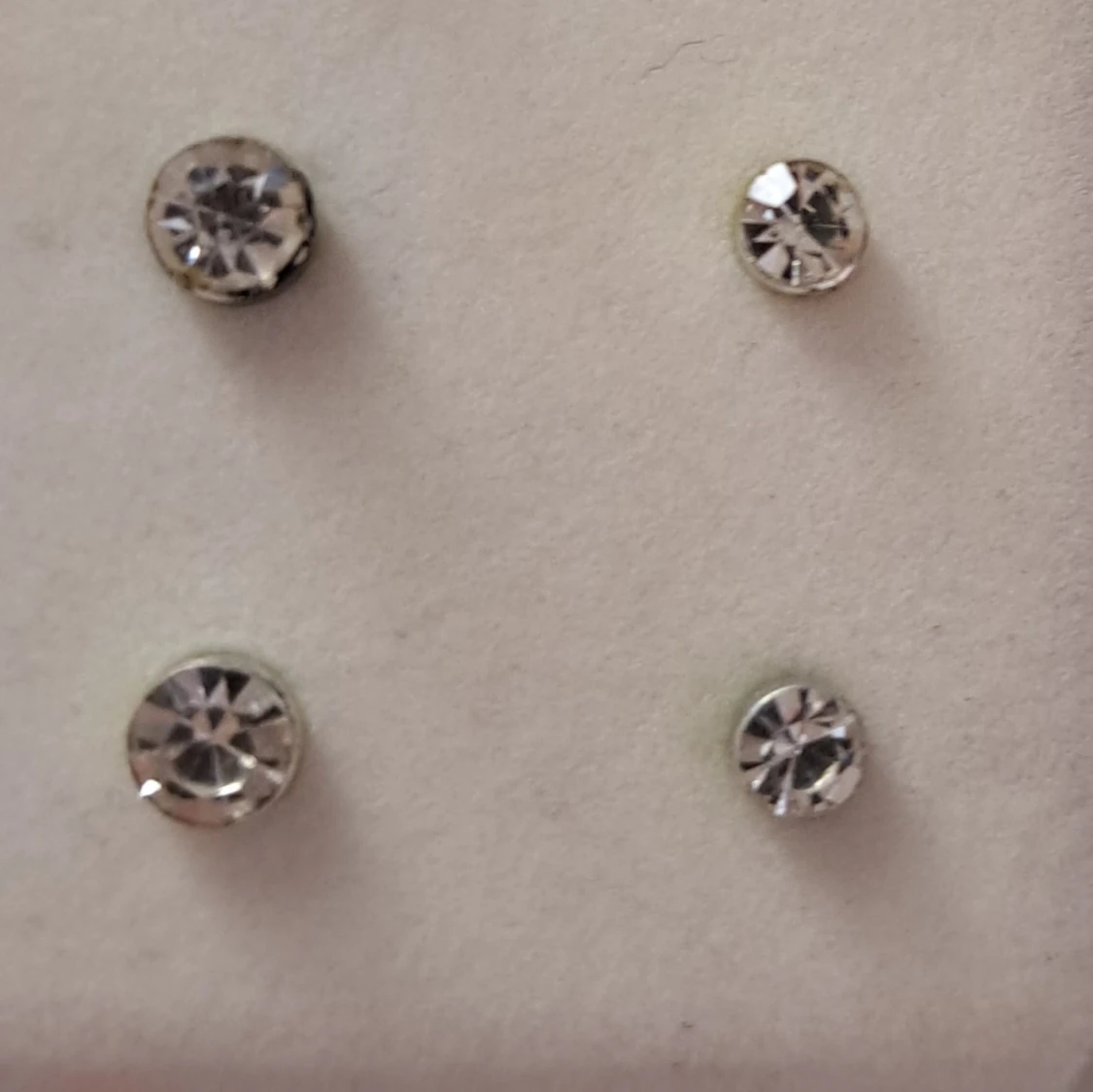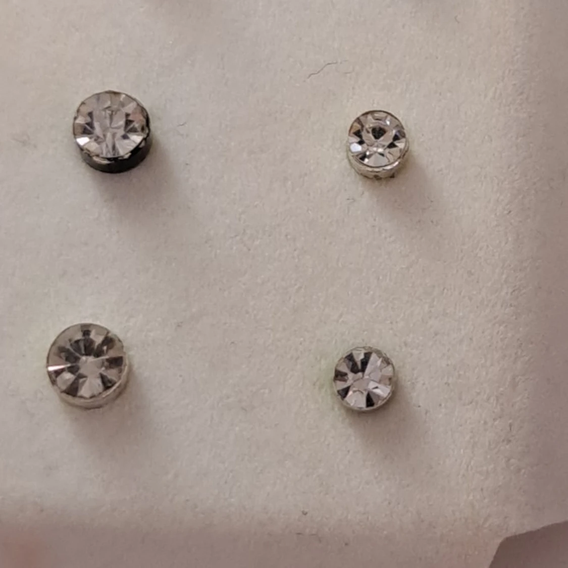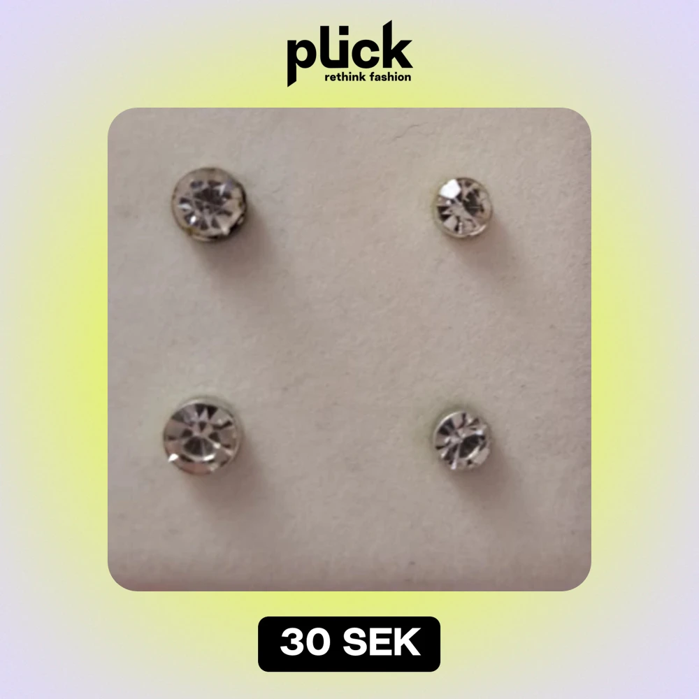 Ett set med fyra örhängen i olika storlekar, alla med klara stenar. Örhängena är runda och har en silverfärgad bas.