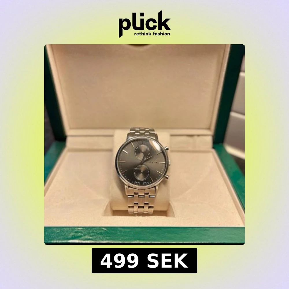Elegant silverfärgad klocka från GANT med en stilren urtavla och två sub-dials. Armbandet är i rostfritt stål med en klassisk länkdesign. Perfekt för den som söker en tidlös accessoar. Mycket fint skick.