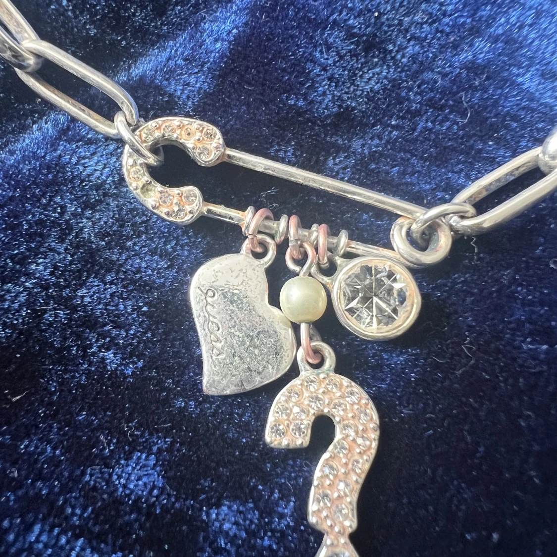 Guess halsband i älkta silver säljes. Berlockerna och ”säkerhetsnålen” verkar inte vara i äkta silver då de tappat färg som ni kan se men kedjan är i 925