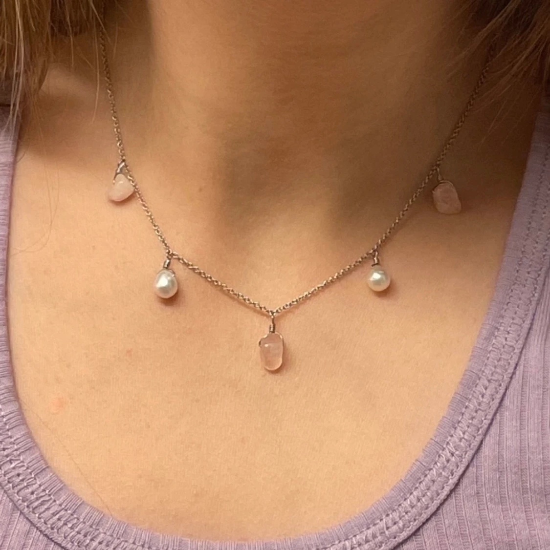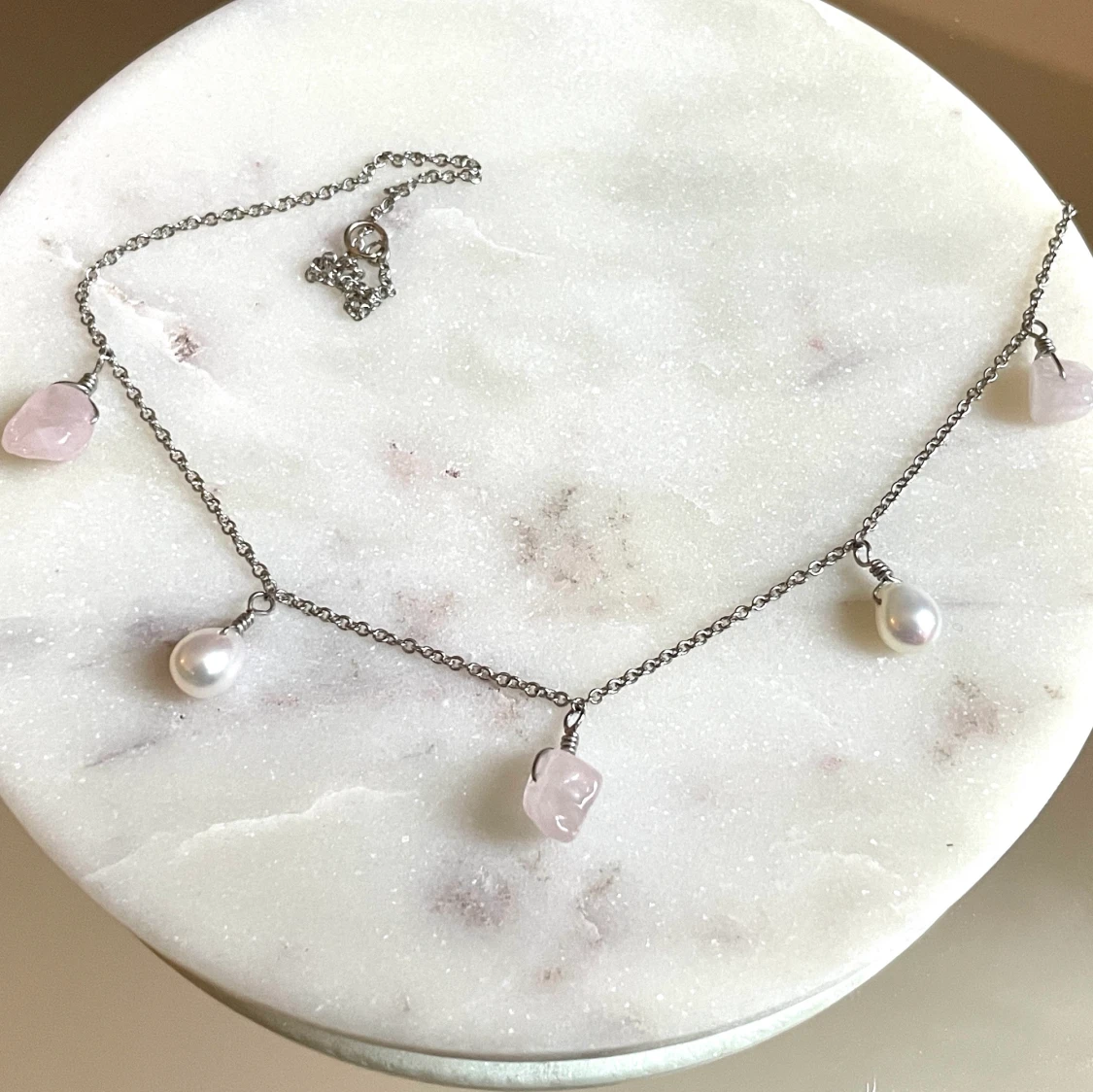 Halsband med äkta rosenkvarts och pärlor.