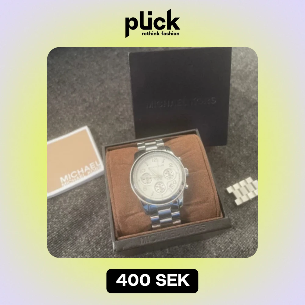 En silvrig Michael kors klocka. Någon ytlig repa finns då den är använd ju men inget som störs. Extra länkar o Ask medföljer! Batteri byte behövs då den legat i lådan länge. Självklart äkta!!