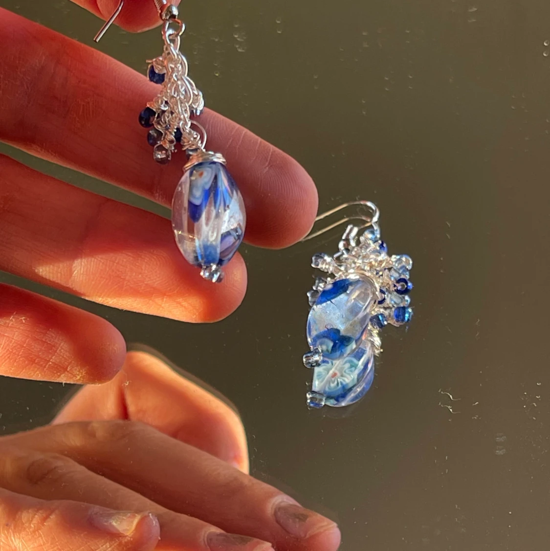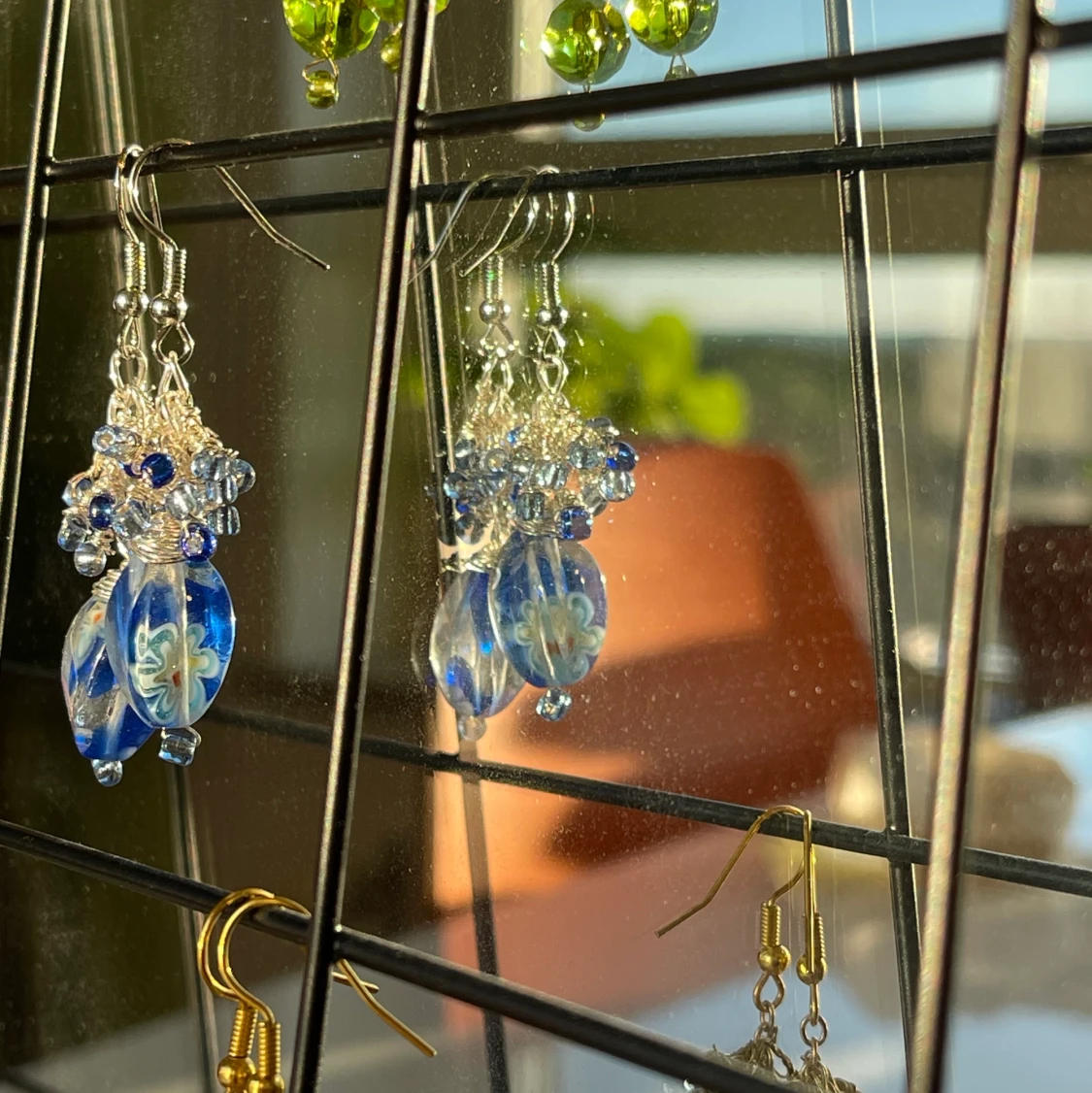 Ett par handgjorda örhängen med blå glaspärlor i olika nyanser och silvrig ståltråd!!!! Ca 4 cm med en kedja som bas :) ************************** Kolla gärna in min profil där jag har en massa mer smycken utlagda!! Frakt ingår i priset, perfekta för dig som vill sätta en personlig prägel på stilen eller att ge bort i present 🔮💕🧿