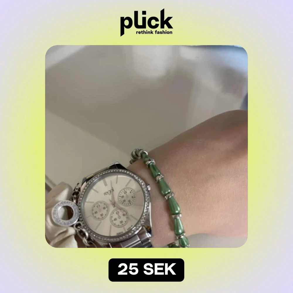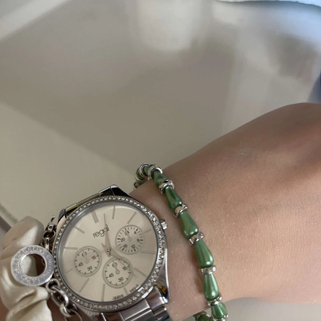 Egengjort pärlarmband med gröna och silvriga pärlor