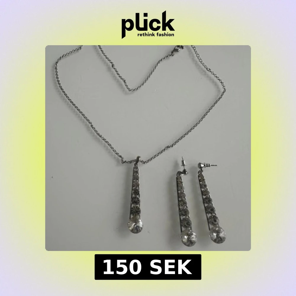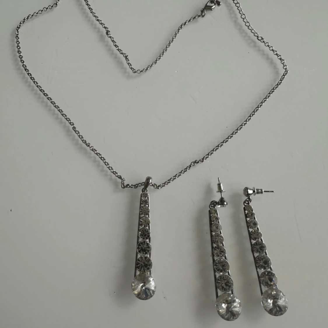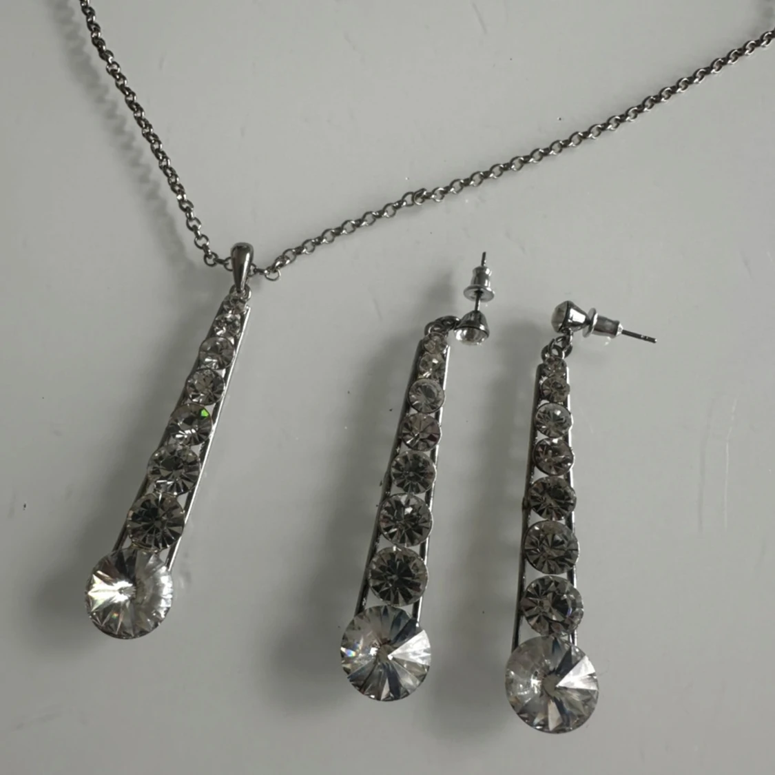 Snyggt smyckeset med halsband och matchande örhängen i silverfärg. Både halsbandet och örhängena har avlånga hängen med flera glittrande stenar och en större kristall längst ner