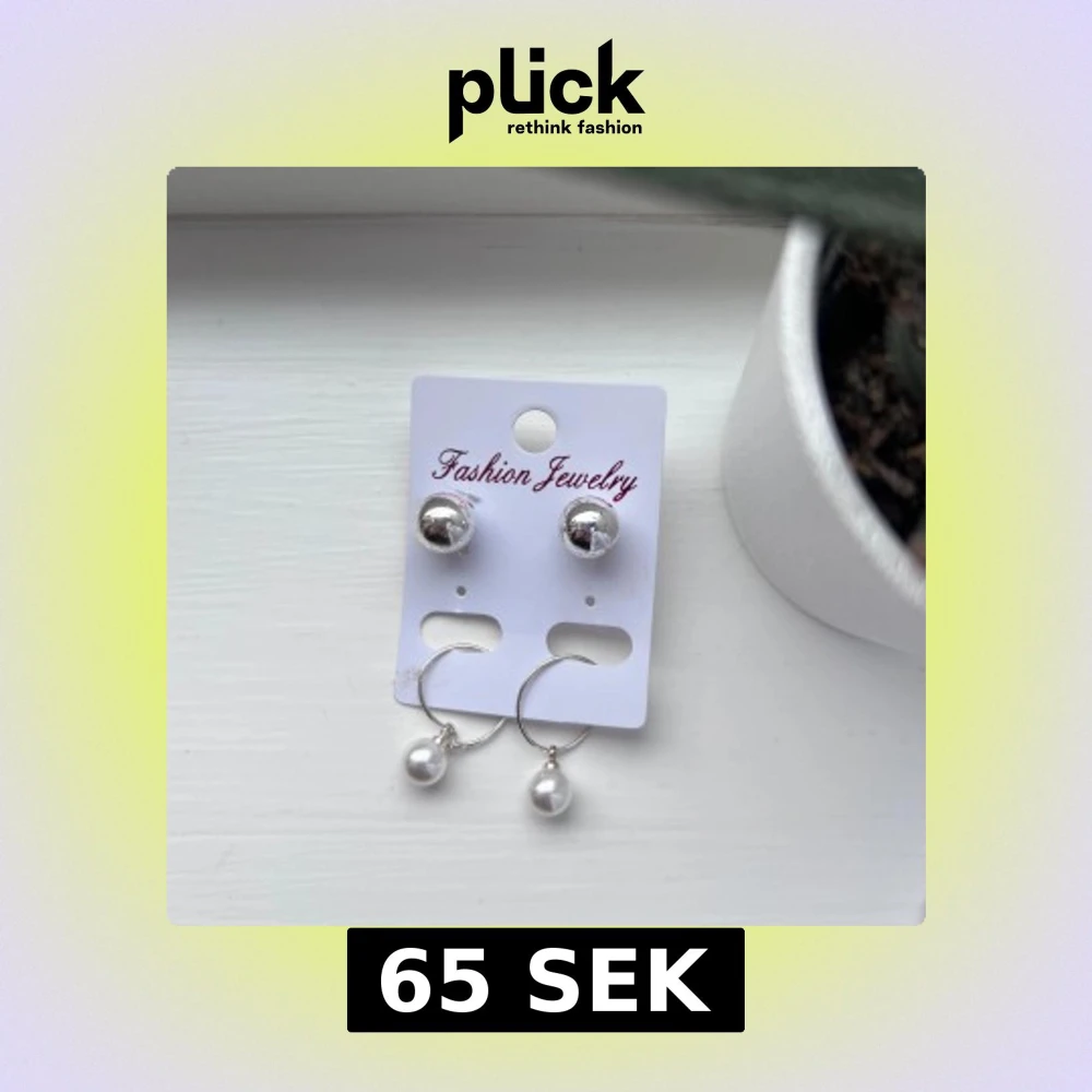 Två par örhängen i silverfärg – ett par klassiska klotformade studs och ett par hoops med hängande vita pärlor. Perfekta accessoarer för att lyfta din look med en stilren touch. Önskar du veta exakta mått? Tveka inte att höra av dig!