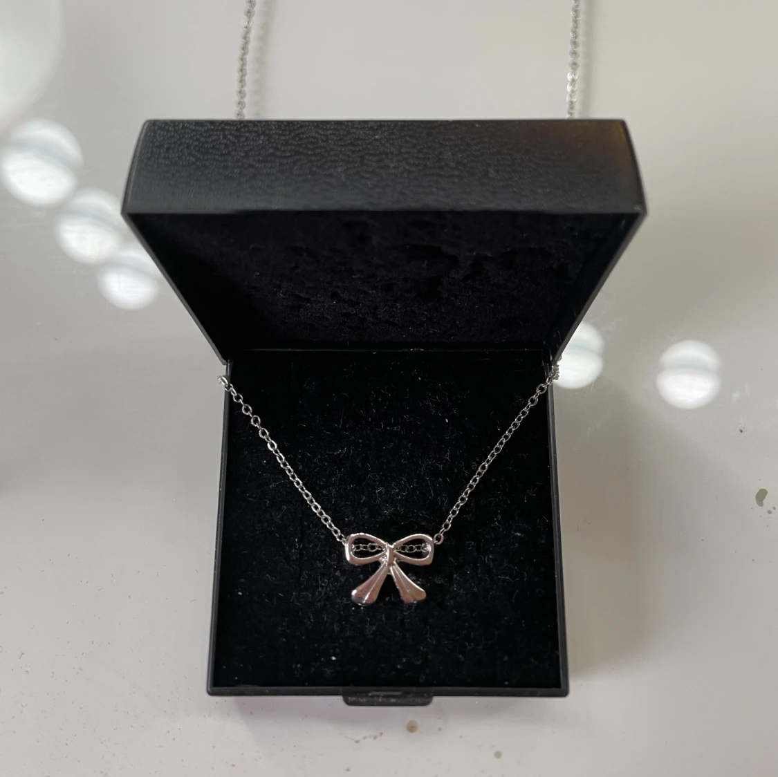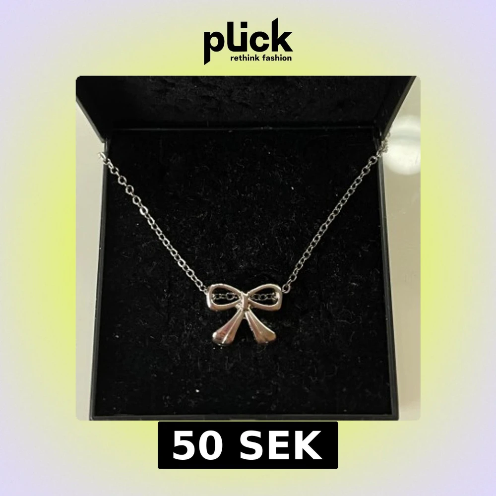 Ett stilrent halsband i silverfärgad metall med en gullig rosett som hänge. Kedjan är tunn och smidig, perfekt för att ge en extra touch till din outfit. Rosetten har en blank finish som fångar ljuset snyggt. Ej riktigt silver.