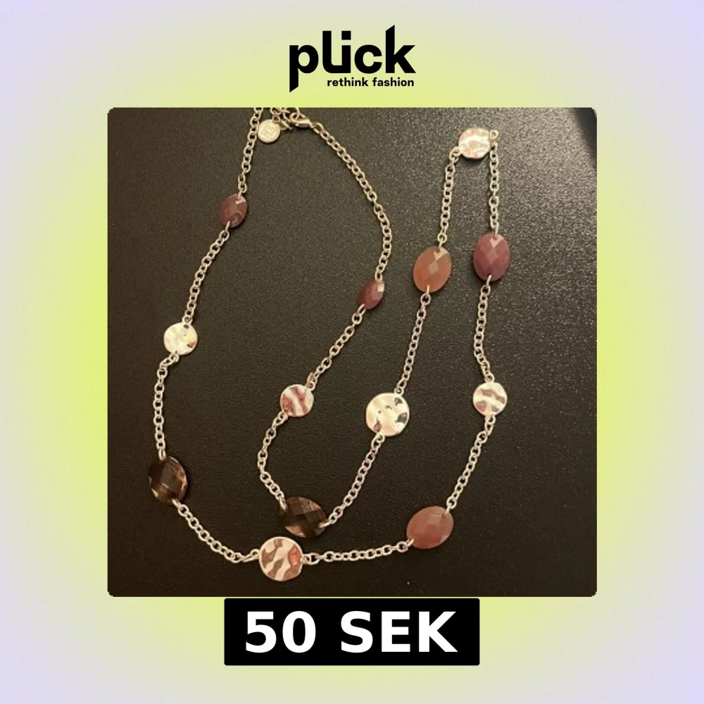 Snyggt långt halsband med silverfärgad kedja och växelvis runda och ovala länkar i brun och silver.