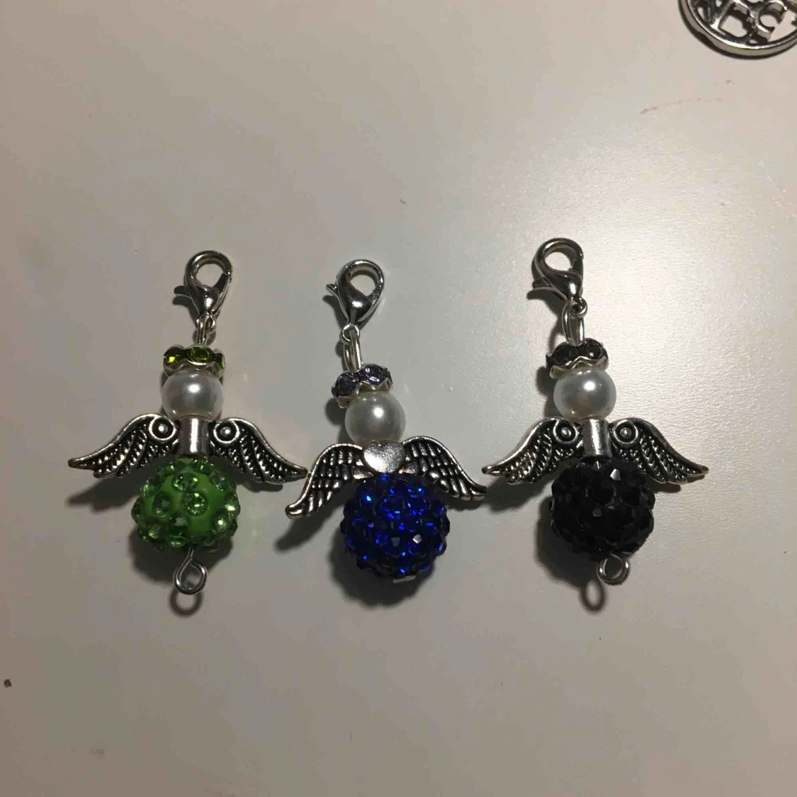 3 st lyckoänglar i silver och är i färgerna grön, blå och svart. En för 15kr eller alla tre för 30kr. Du kan sätta på dom på t.ex. halsband, armband, örhängen, nyckelringar och mycket mer.